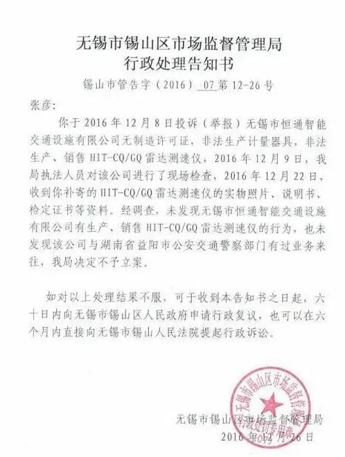 根据徐先生和媒体的调查,发现雷达测速仪是由无锡市恒通智能交通设施有限公司生产,但是该公司的注册地址竟然是民宅,而房主也否认与这家公司有关。不过,负责采购的部门并非从生产厂家直接进货,而是从第三方经销商手中购买。