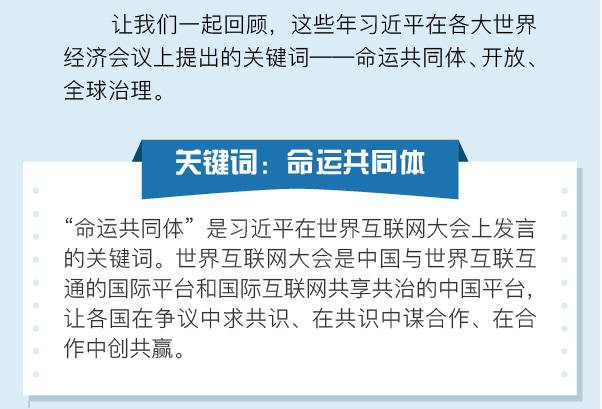 让我们一起回顾,这些年习近平在各大世界经济会议上提出的关键词—命运共同体、开放、全球治理。