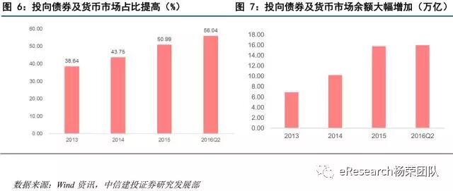 2013年后实体经济收益率开始下降,再加上非标业务受到限制,银行开始转换理财的配置方向。银行直接投资或者委外都加大了债券的配置。债券是理财产品的重点配置方向,在理财资金投资的12大类资产中占比最高。从图6中也可以大致看出,债券及货币市场占比有所提高。增量资金在二级市场上竞争较少的资产,资金流向实体少,债券收益率在此情况下下行。银行的理财资金对资产价格的提高起到了推波助澜的作用。在新发行债券量少的情况下,理财实际上对实体的帮助作用其实打了折扣。