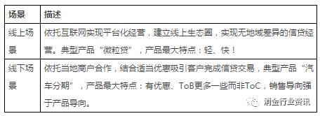 基于线下场景十分常见的一类模式,典型业务包括各家金融机构的商场分期、汽车分期、家装、车位等分期业务,通过在商户发掘具有消费需求的客户,通过优惠引导客户办理分期,最后将款项直接拨付给商户完成结算,中间资金不接触客户,保证了资金流向,风险可控。
