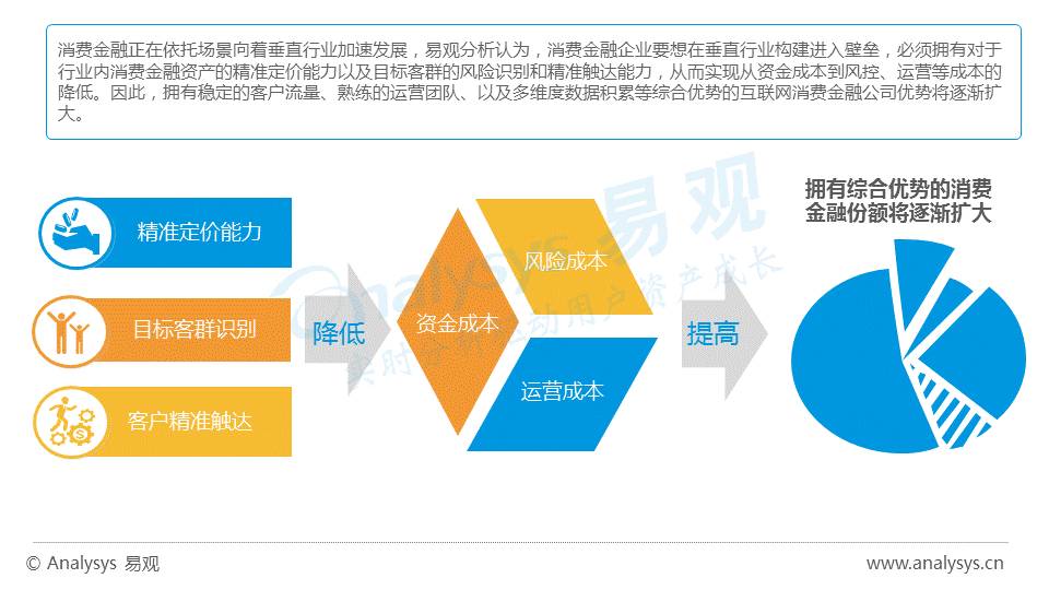 消费金融正在依托场景向着垂直行业加速发展,易观分析认为,消费金融企业要想在垂直行业构建进入壁垒,必须拥有对于行业内消费金融资产的精准定价能力以及目标客群的风险识别和精准触达能力,从而实现从资金成本到风控、运营等成本的降低。