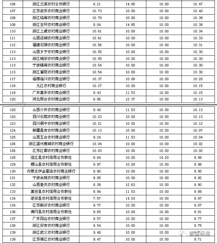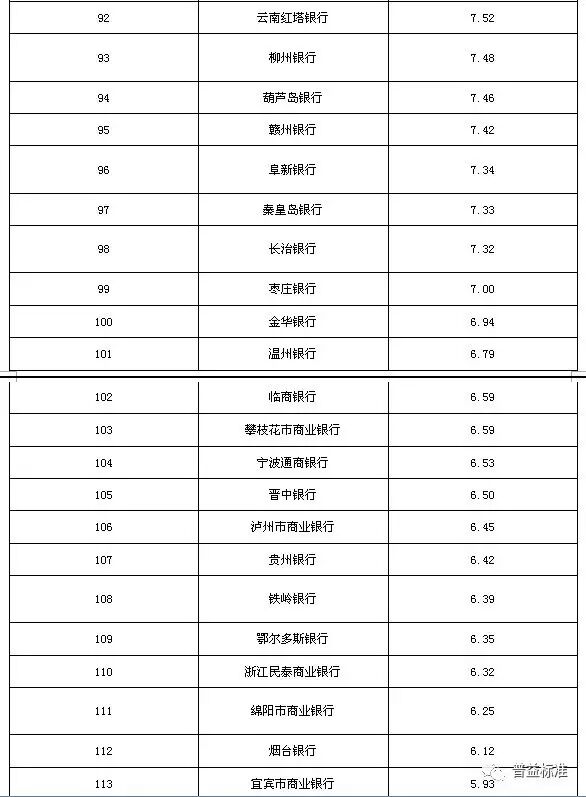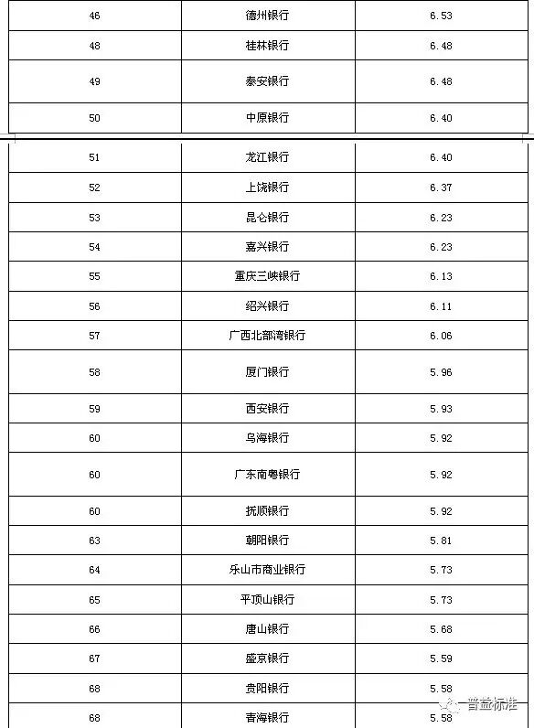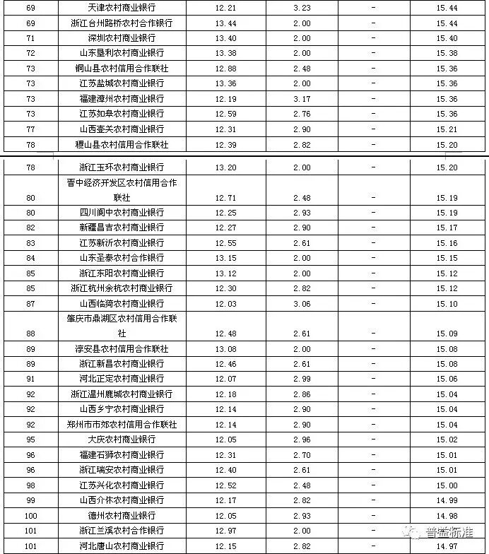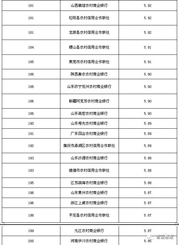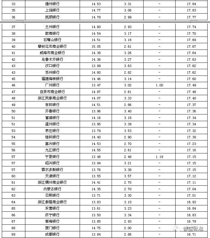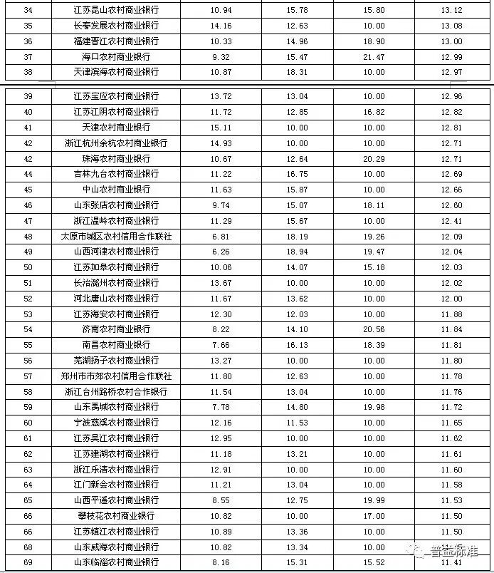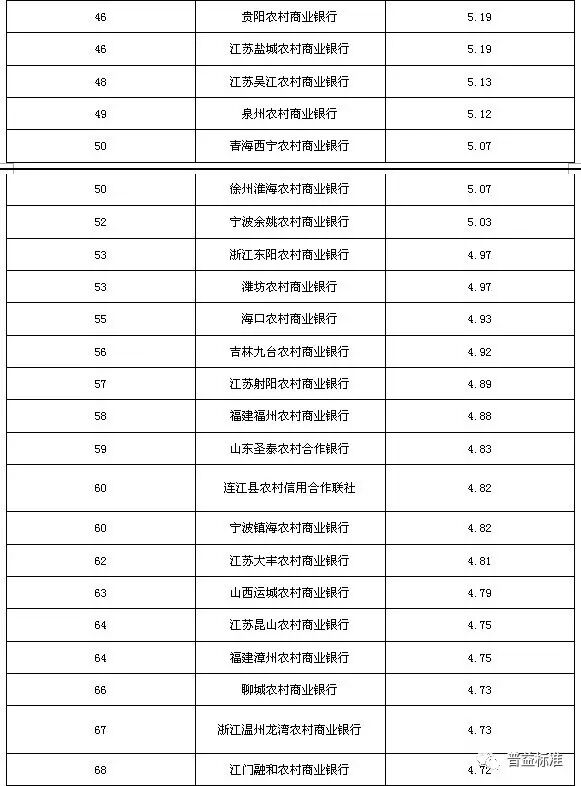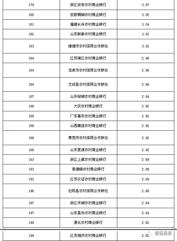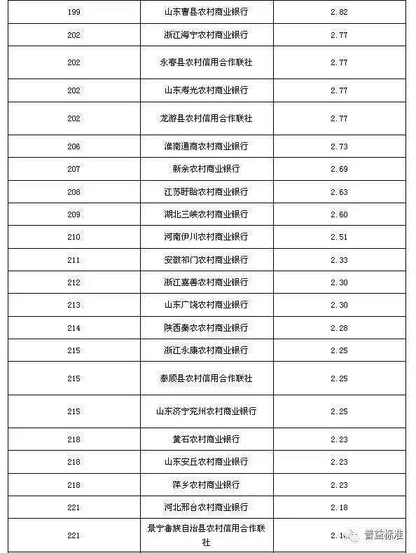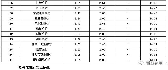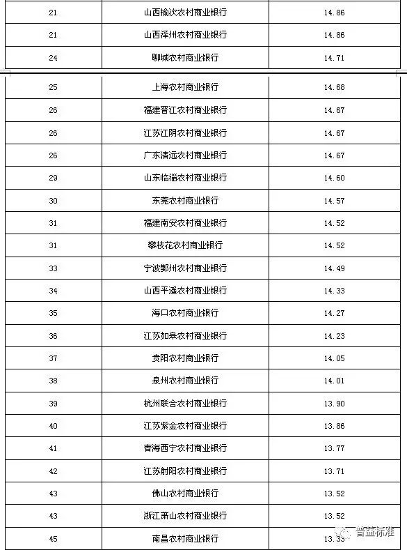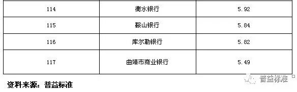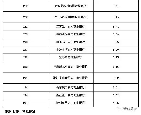 收益能力:招商银行、兴业银行、广发银行、华夏银行和交通银行居全国性银行前五;南京银行、江苏银行、宁波银行、东莞银行、重庆银行、珠海华润银行、包商银行、广东华兴银行、杭州银行、长沙银行位居城市商业银行前十名;广州农村商业银行、厦门农村商业银行、福建晋江农村商业银行、江苏紫金农村商业银行、泉州农村商业银行、广东顺德农村商业银行、福建南安农村商业银行、江苏昆山农村商业银行、合肥科技农村商业银行、青岛农村商业银行居农村金融机构前十名