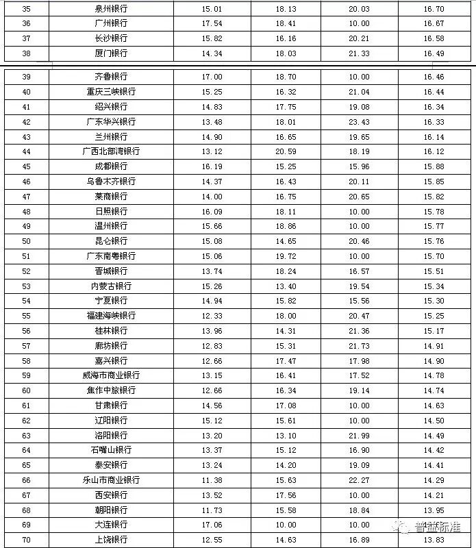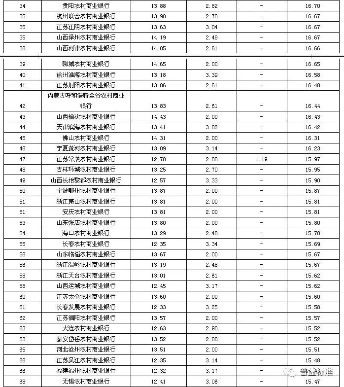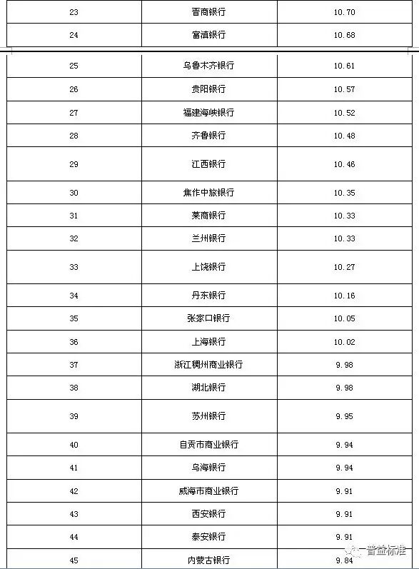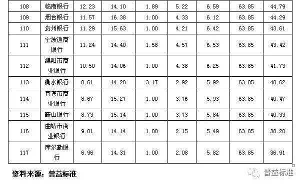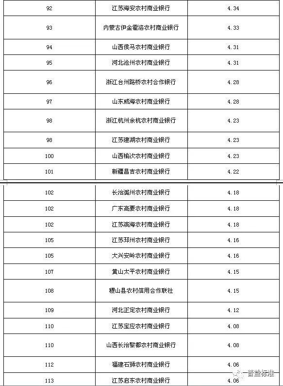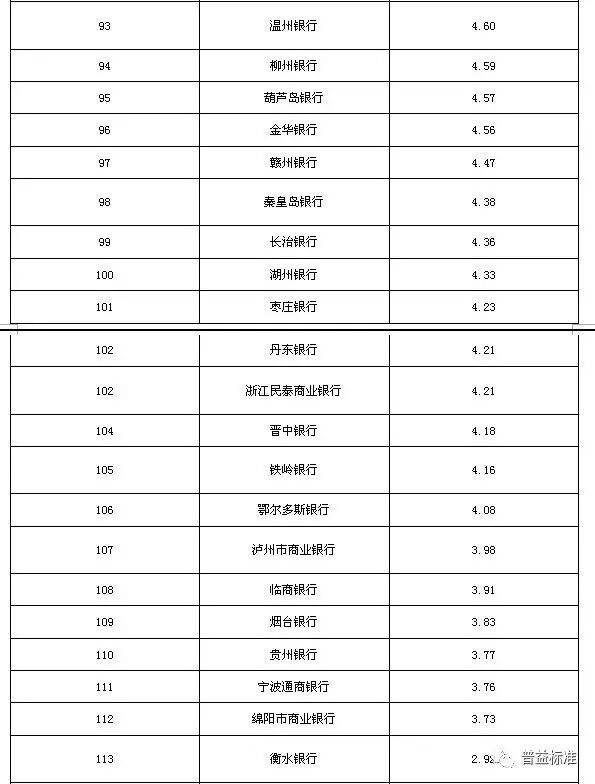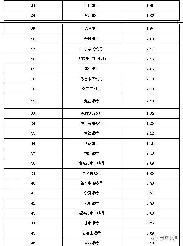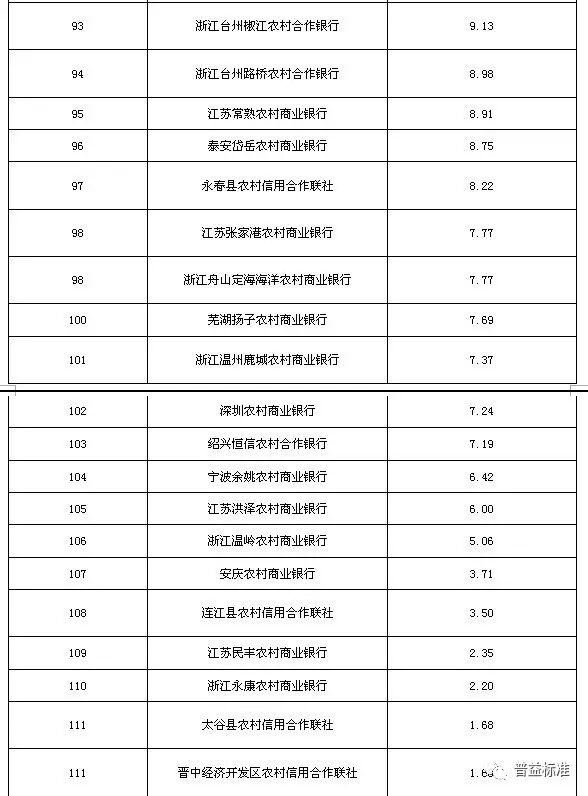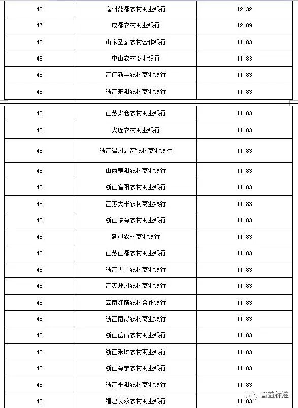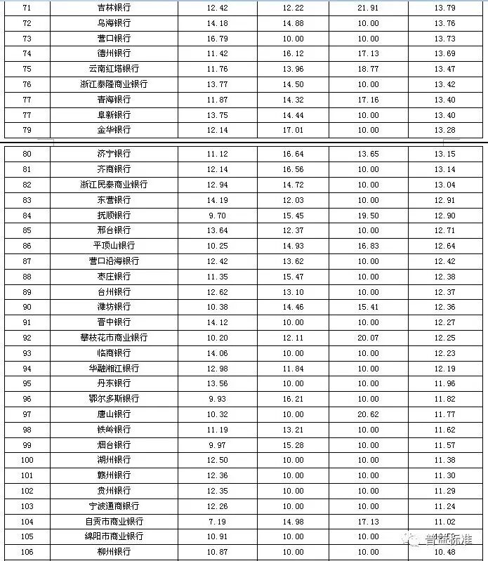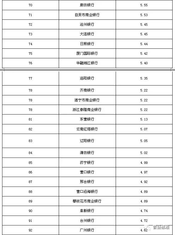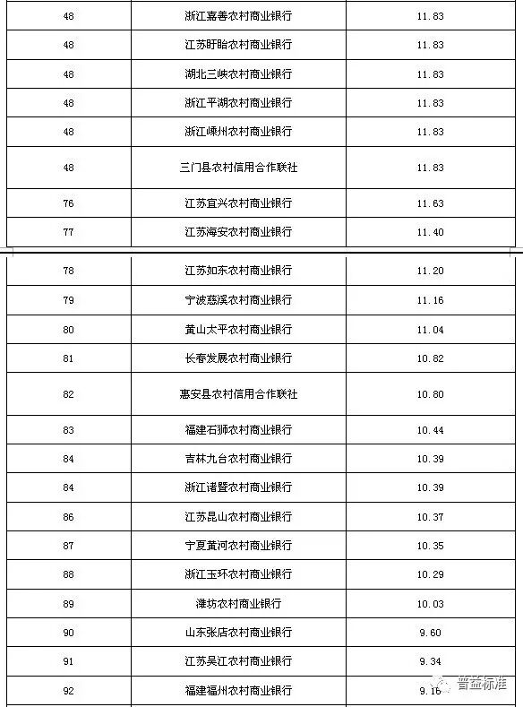 收益能力:招商银行、兴业银行、广发银行、华夏银行和交通银行居全国性银行前五;南京银行、江苏银行、宁波银行、东莞银行、重庆银行、珠海华润银行、包商银行、广东华兴银行、杭州银行、长沙银行位居城市商业银行前十名;广州农村商业银行、厦门农村商业银行、福建晋江农村商业银行、江苏紫金农村商业银行、泉州农村商业银行、广东顺德农村商业银行、福建南安农村商业银行、江苏昆山农村商业银行、合肥科技农村商业银行、青岛农村商业银行居农村金融机构前十名