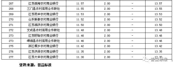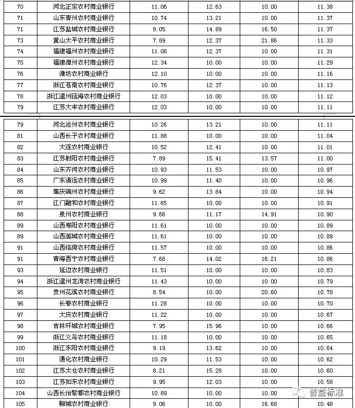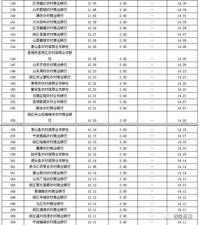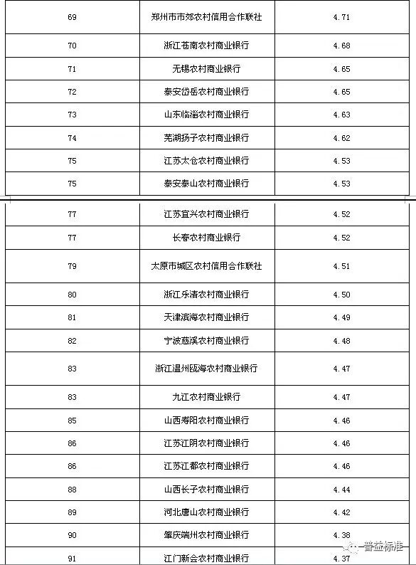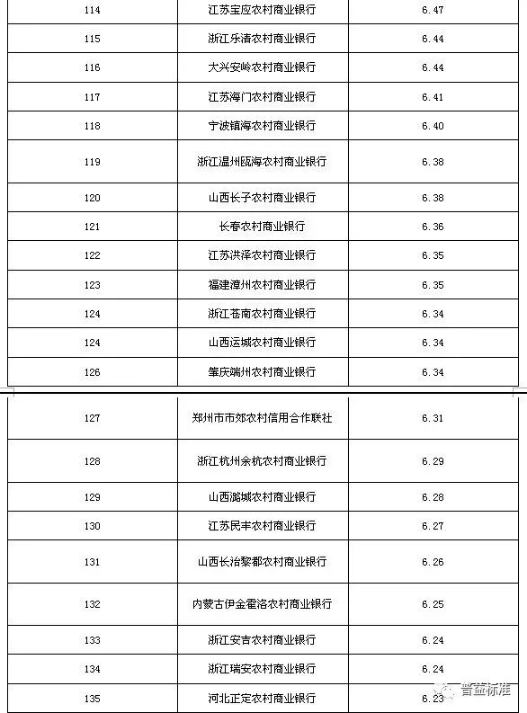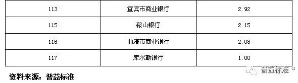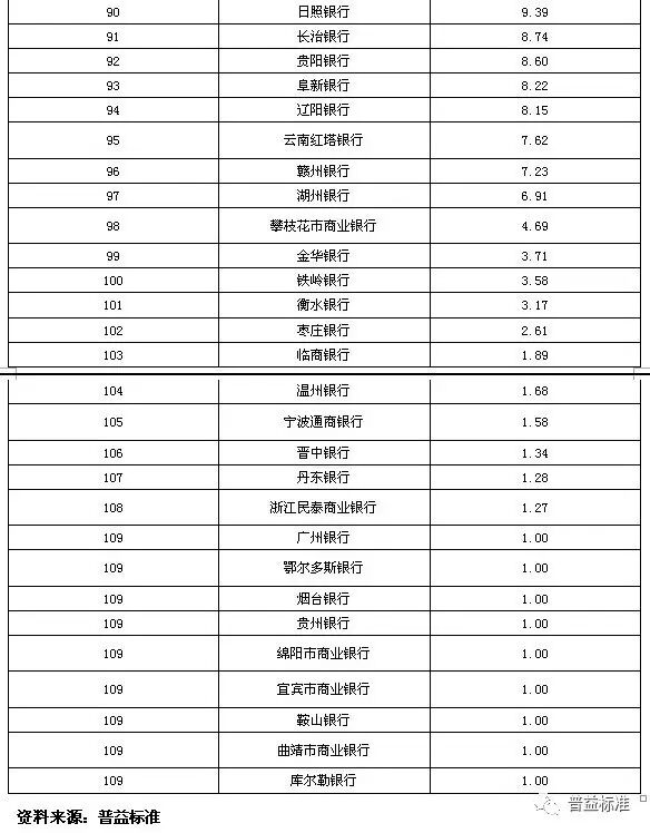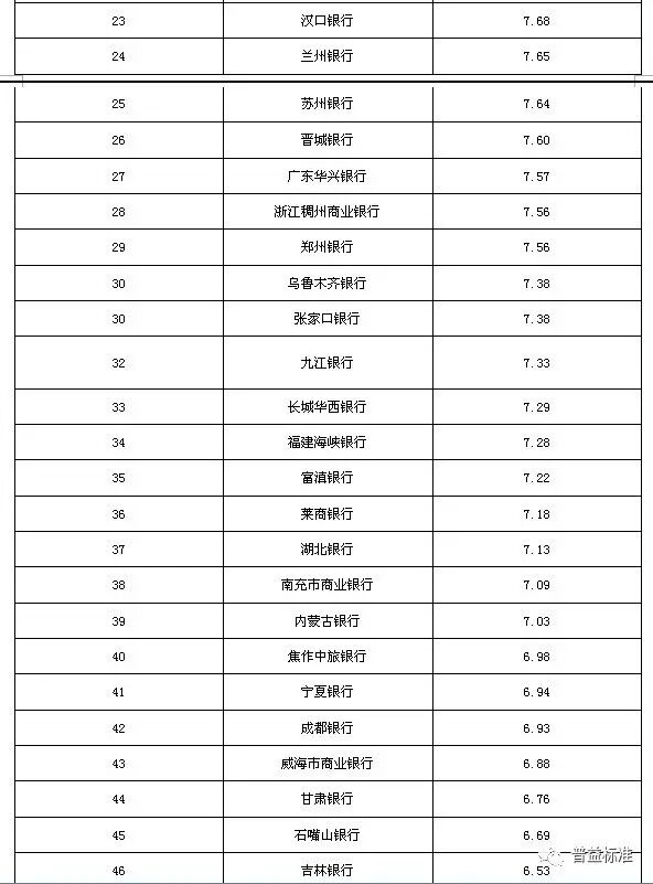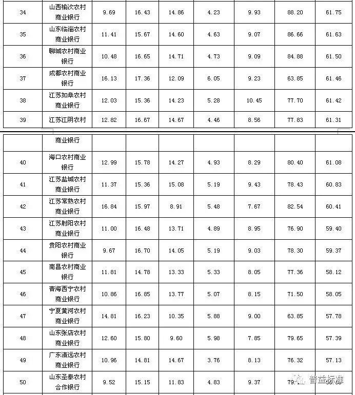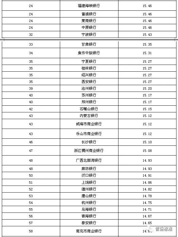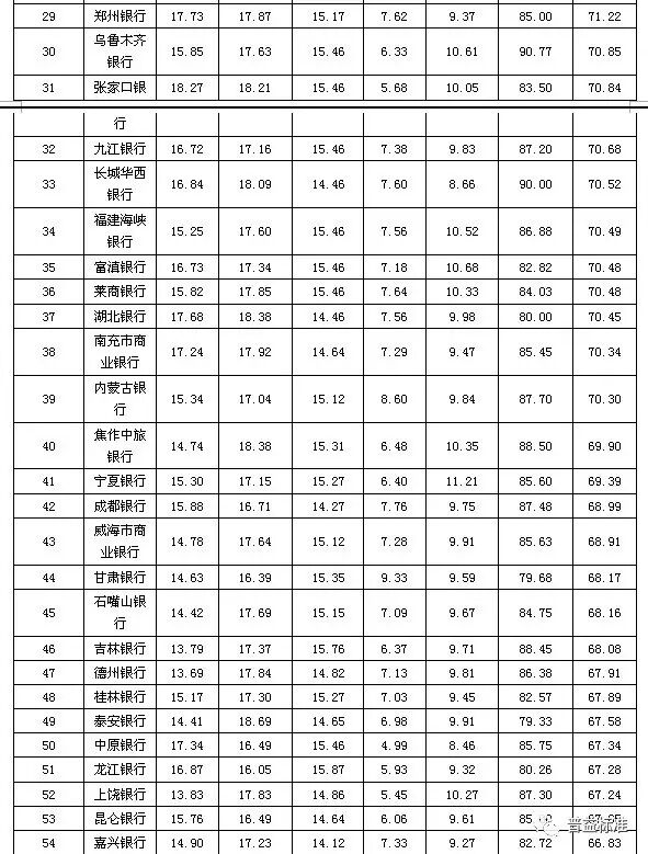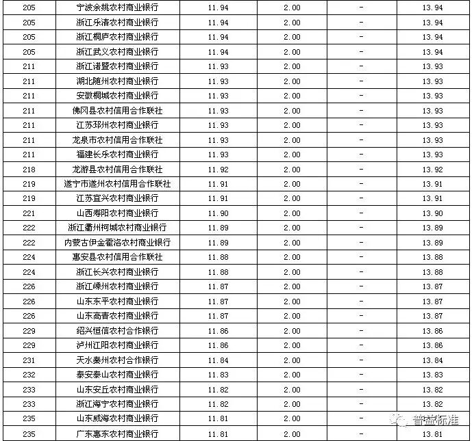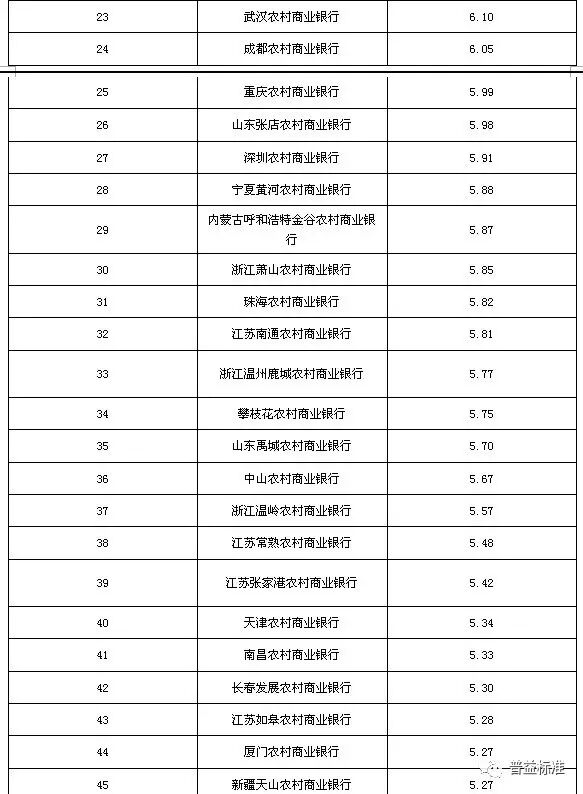 收益能力:招商银行、兴业银行、广发银行、华夏银行和交通银行居全国性银行前五;南京银行、江苏银行、宁波银行、东莞银行、重庆银行、珠海华润银行、包商银行、广东华兴银行、杭州银行、长沙银行位居城市商业银行前十名;广州农村商业银行、厦门农村商业银行、福建晋江农村商业银行、江苏紫金农村商业银行、泉州农村商业银行、广东顺德农村商业银行、福建南安农村商业银行、江苏昆山农村商业银行、合肥科技农村商业银行、青岛农村商业银行居农村金融机构前十名