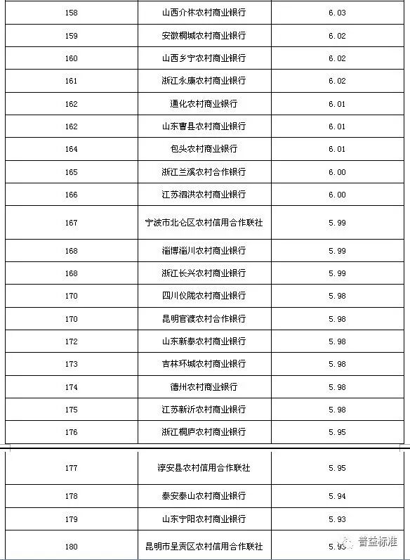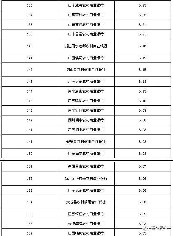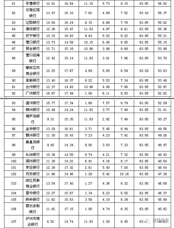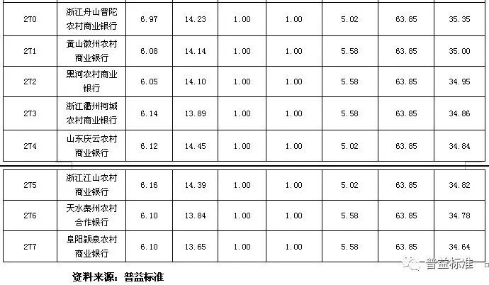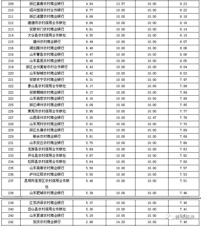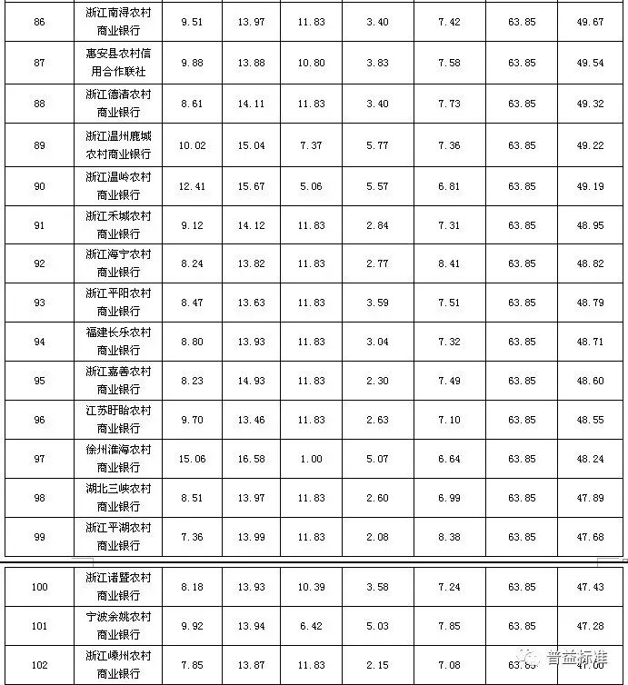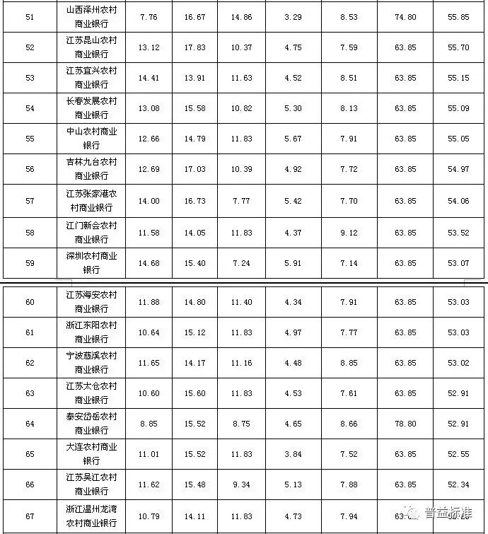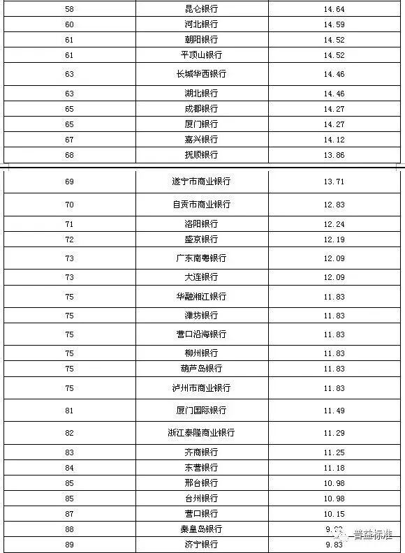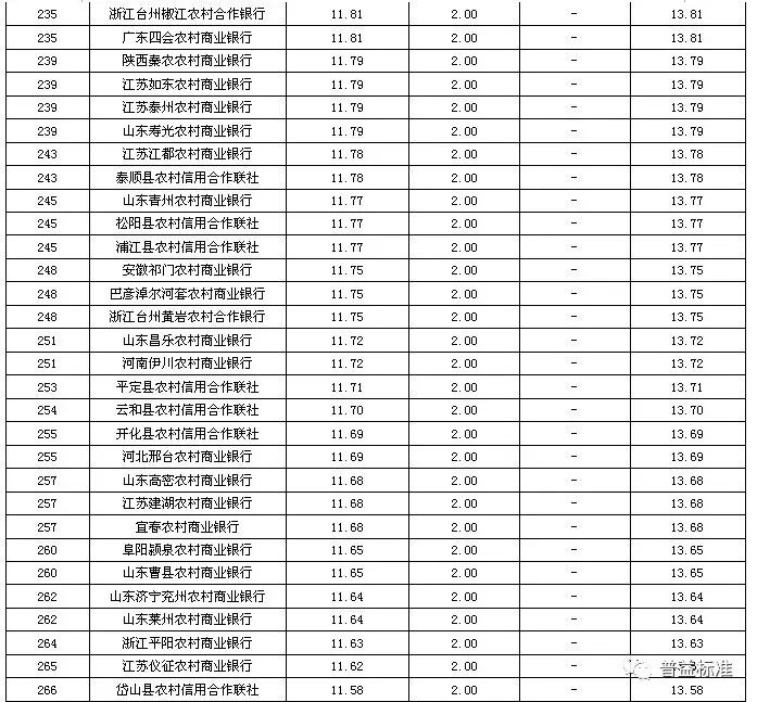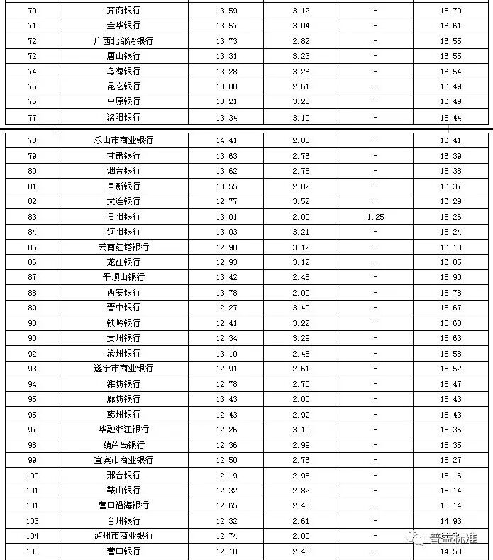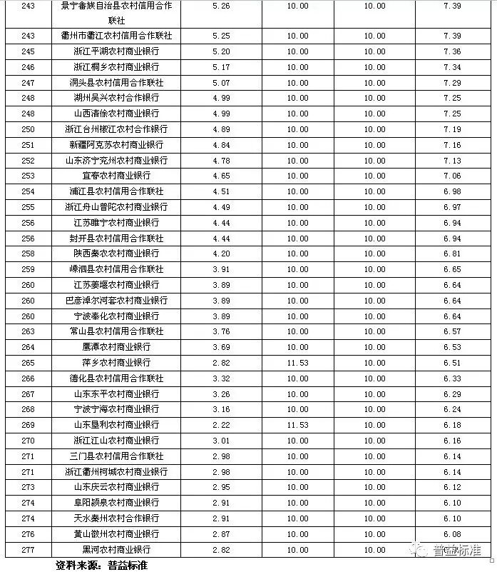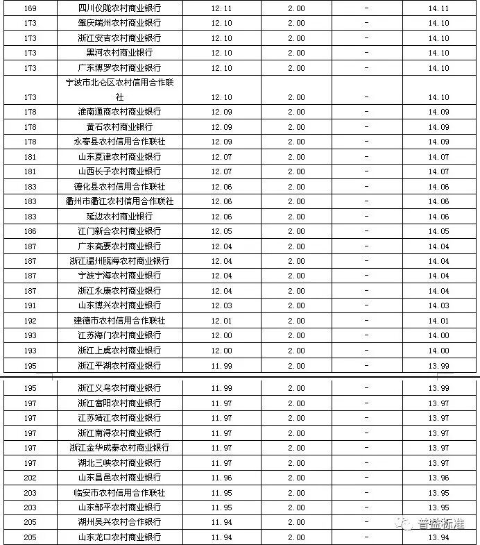 收益能力:招商银行、兴业银行、广发银行、华夏银行和交通银行居全国性银行前五;南京银行、江苏银行、宁波银行、东莞银行、重庆银行、珠海华润银行、包商银行、广东华兴银行、杭州银行、长沙银行位居城市商业银行前十名;广州农村商业银行、厦门农村商业银行、福建晋江农村商业银行、江苏紫金农村商业银行、泉州农村商业银行、广东顺德农村商业银行、福建南安农村商业银行、江苏昆山农村商业银行、合肥科技农村商业银行、青岛农村商业银行居农村金融机构前十名