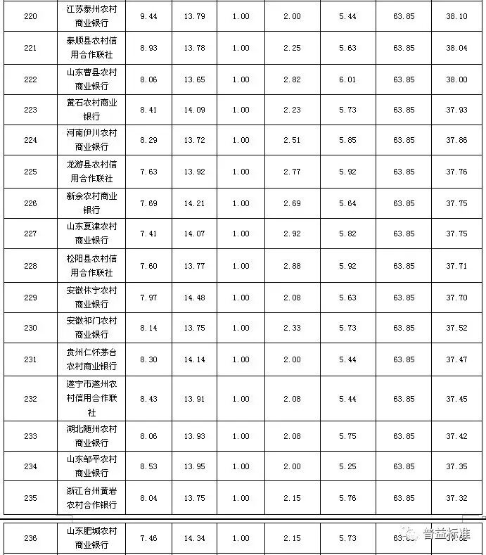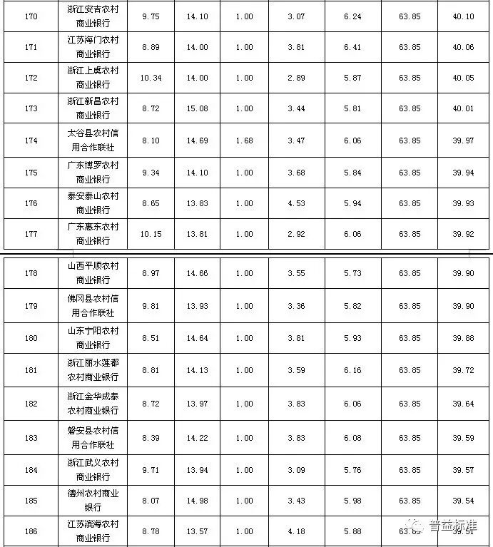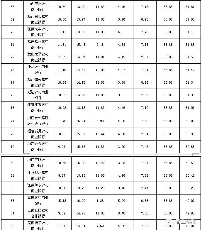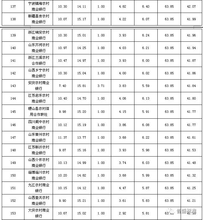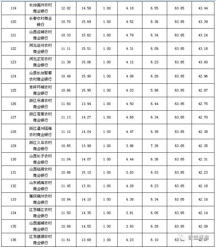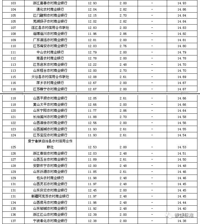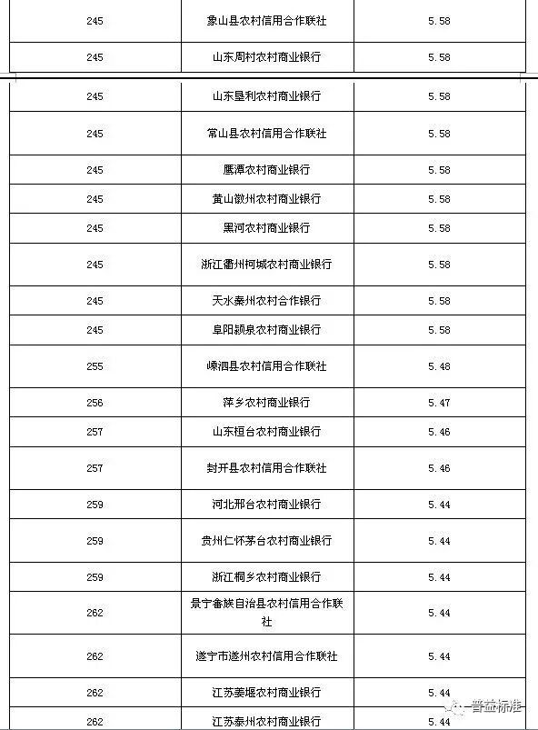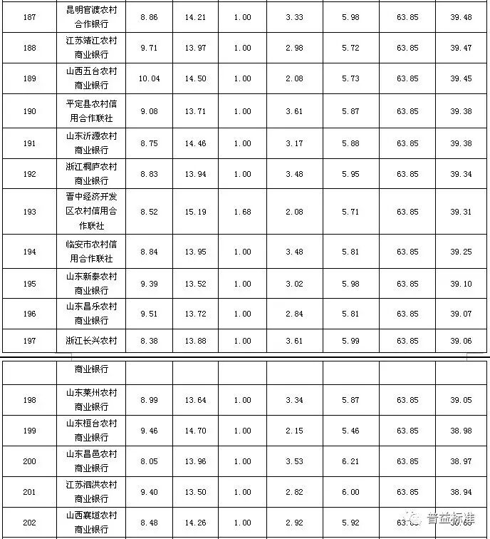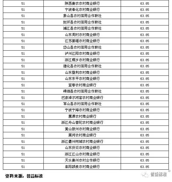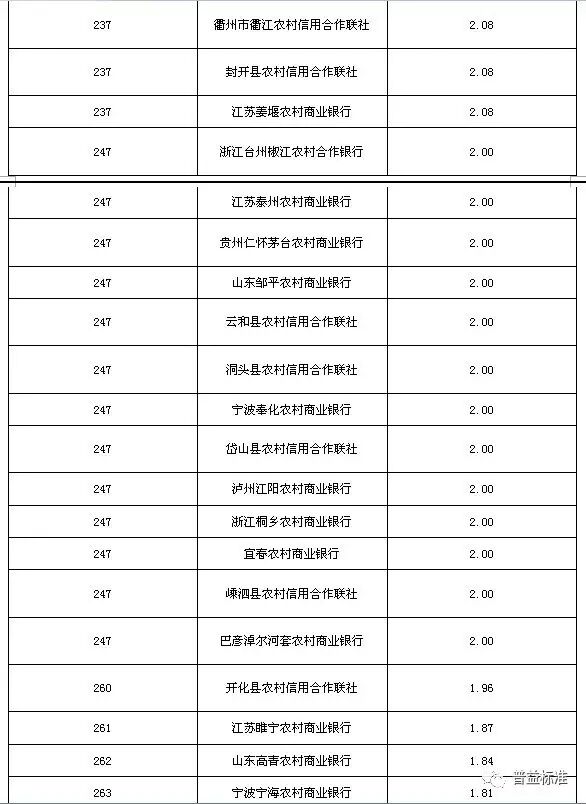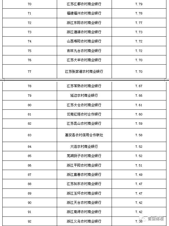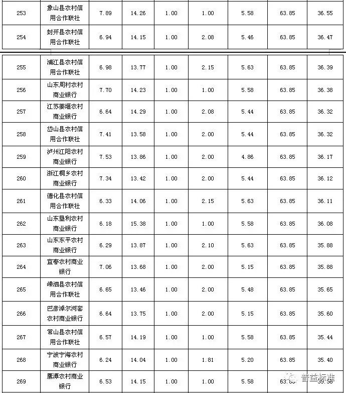 收益能力:招商银行、兴业银行、广发银行、华夏银行和交通银行居全国性银行前五;南京银行、江苏银行、宁波银行、东莞银行、重庆银行、珠海华润银行、包商银行、广东华兴银行、杭州银行、长沙银行位居城市商业银行前十名;广州农村商业银行、厦门农村商业银行、福建晋江农村商业银行、江苏紫金农村商业银行、泉州农村商业银行、广东顺德农村商业银行、福建南安农村商业银行、江苏昆山农村商业银行、合肥科技农村商业银行、青岛农村商业银行居农村金融机构前十名