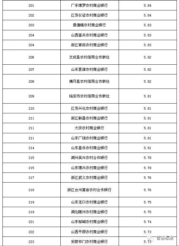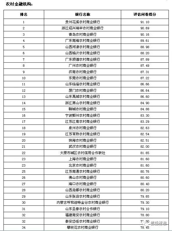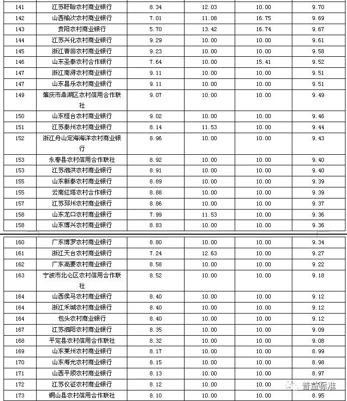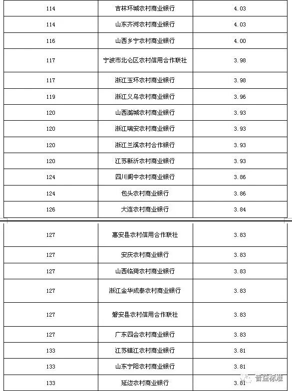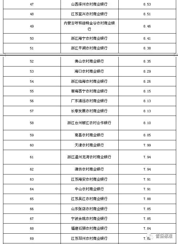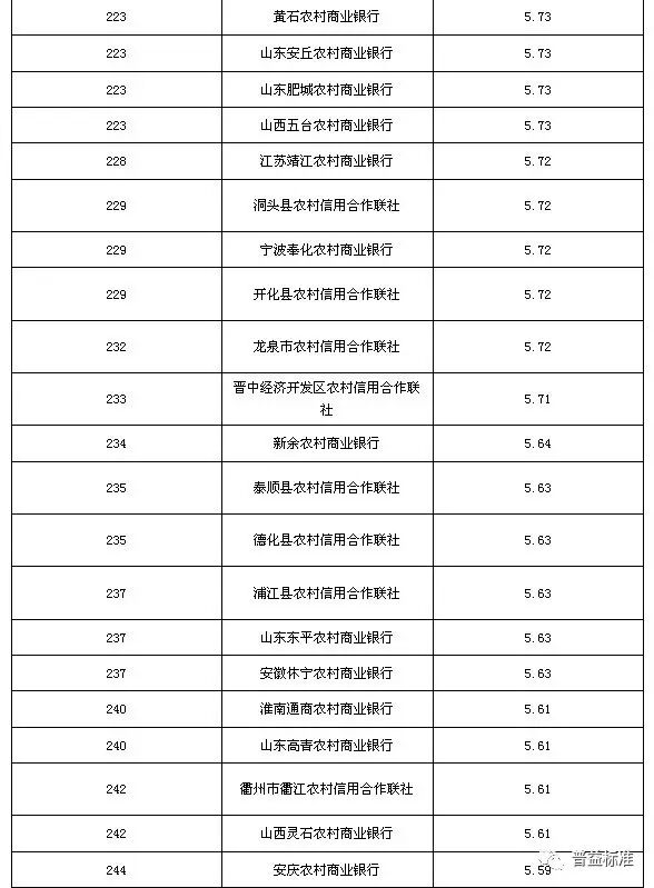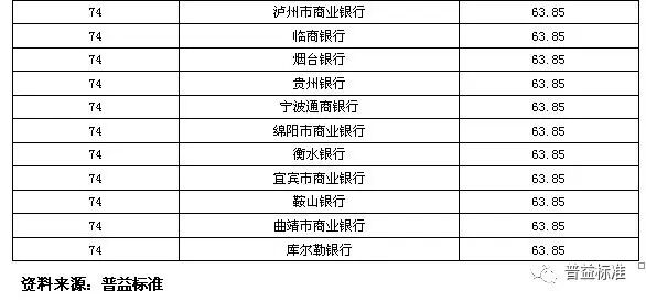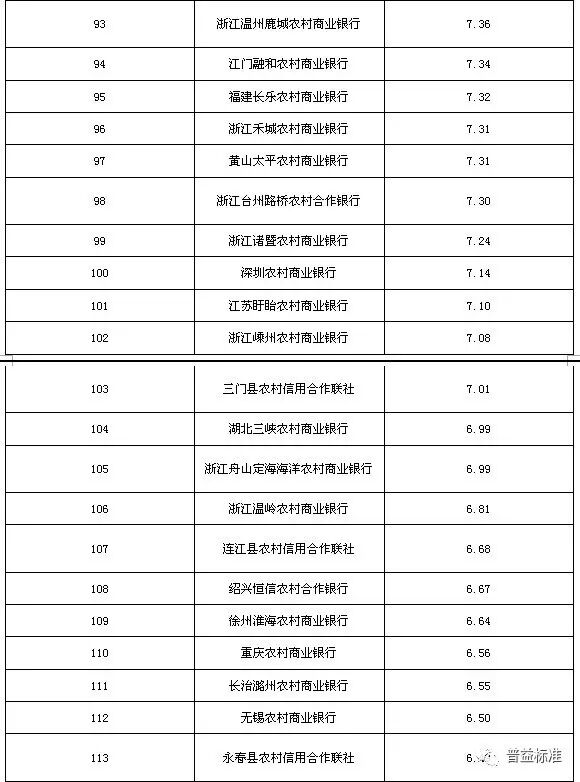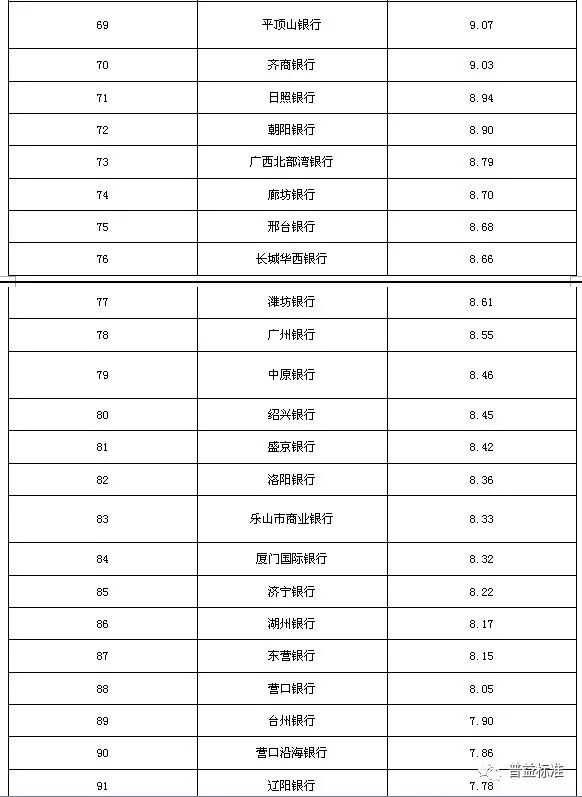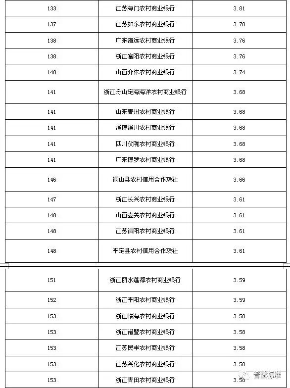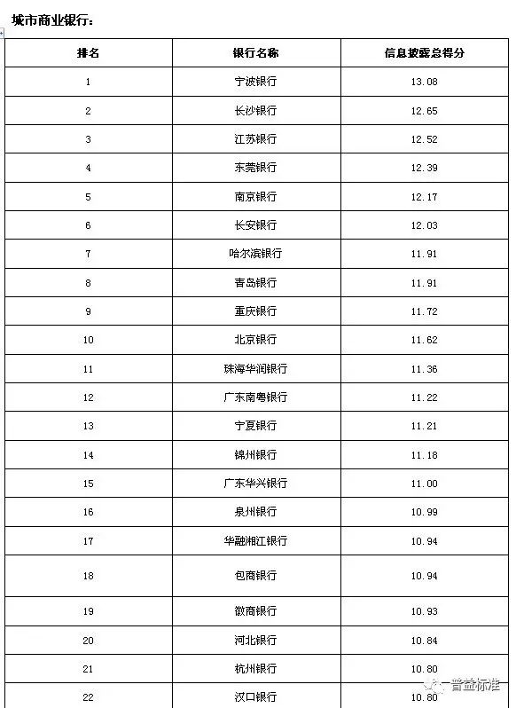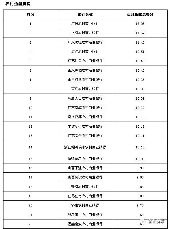 信息披露规范性:中国民生银行、兴业银行、华夏银行、渤海银行和中国光大银行居全国性银行前五;宁波银行、长沙银行、江苏银行、东莞银行、南京银行、长安银行、哈尔滨银行、青岛银行、重庆银行和北京银行居城市商业银行前十;广州农村商业银行、上海农村商业银行、广东顺德农村商业银行、厦门农村商业银行、江苏如皋农村商业银行、山东禹城农村商业银行、山西河津农村商业银行、青岛农村商业银行、新疆天山农村商业银行和广东南海农村商业银行居农村金融机构前十。