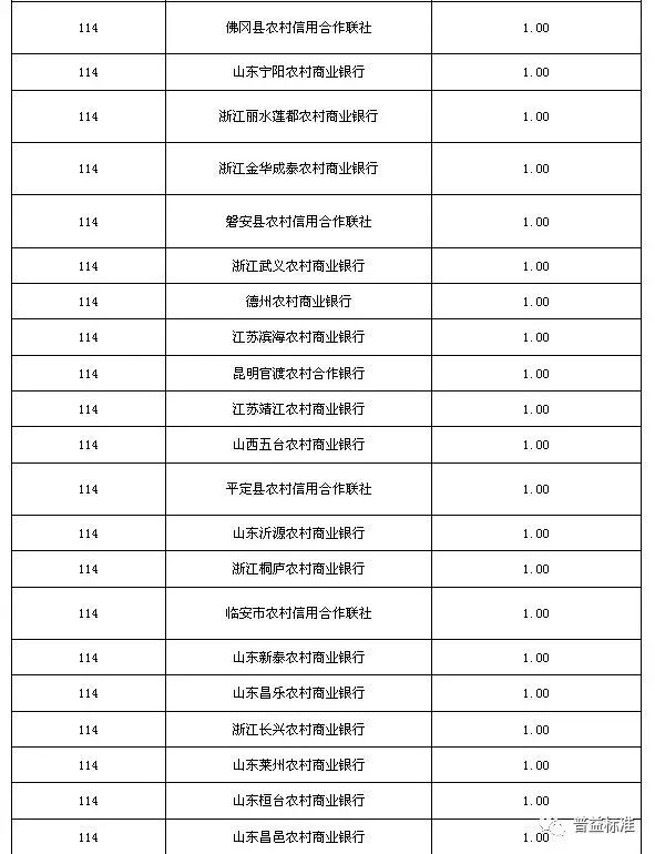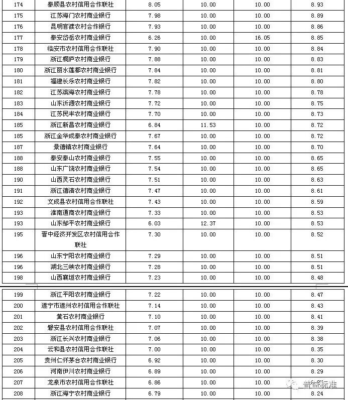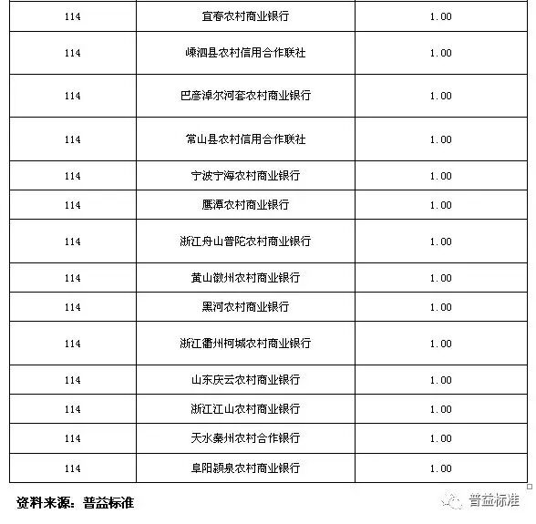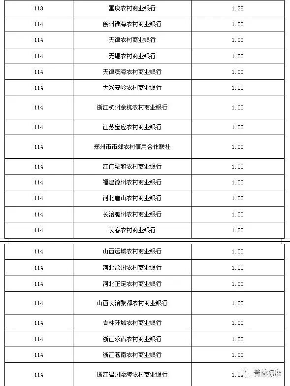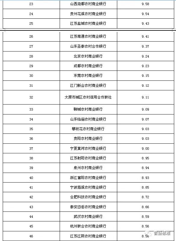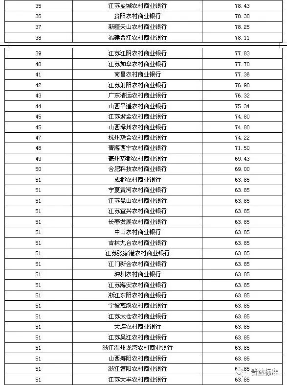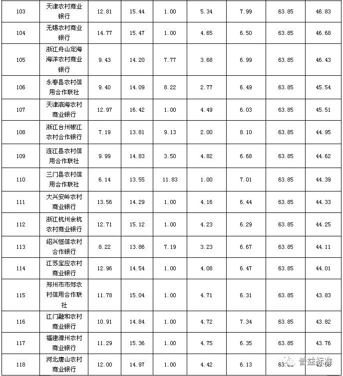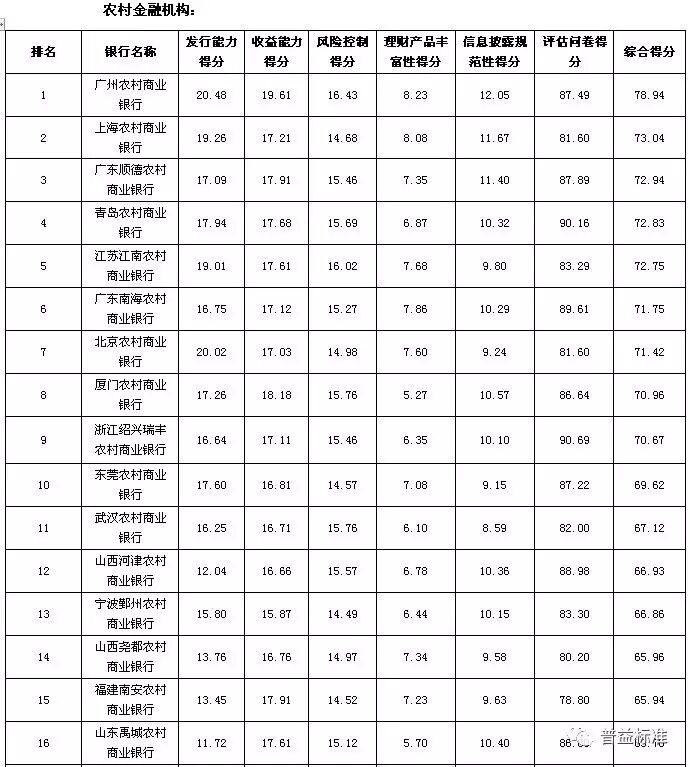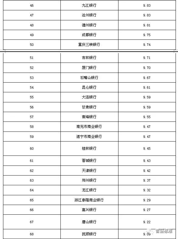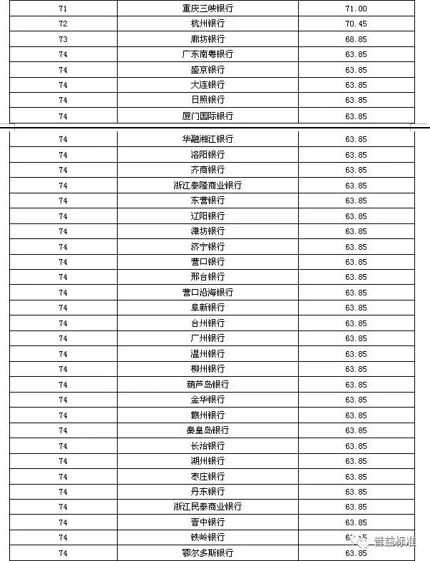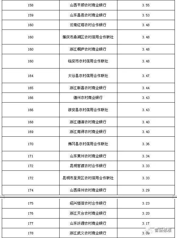 信息披露规范性:中国民生银行、兴业银行、华夏银行、渤海银行和中国光大银行居全国性银行前五;宁波银行、长沙银行、江苏银行、东莞银行、南京银行、长安银行、哈尔滨银行、青岛银行、重庆银行和北京银行居城市商业银行前十;广州农村商业银行、上海农村商业银行、广东顺德农村商业银行、厦门农村商业银行、江苏如皋农村商业银行、山东禹城农村商业银行、山西河津农村商业银行、青岛农村商业银行、新疆天山农村商业银行和广东南海农村商业银行居农村金融机构前十。