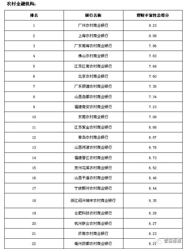 理财产品丰富性:华夏银行、中信银行、中国银行、交通银行以及中国光大银行居全国性银行前五;南京银行、甘肃银行、泉州银行、徽商银行、锦州银行、长沙银行、东莞银行、江苏银行、珠海华润银行和河北银行居城市商业银行前十;广州农村商业银行、上海农村商业银行、广东南海农村商业银行、佛山农村商业银行、江苏江南农村商业银行、北京农村商业银行、广东顺德农村商业银行、山西尧都农村商业银行、福建南安农村商业银行和东莞农村商业银行居农村金融机构前十。