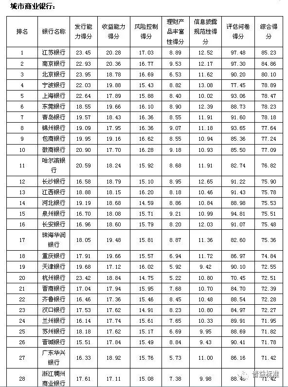 2016年4季度,城市商业银行中,理财能力综合排名前十的银行依次是江苏银行、南京银行、北京银行、宁波银行、上海银行、东莞银行、青岛银行、锦州银行、包商银行和徽商银行。