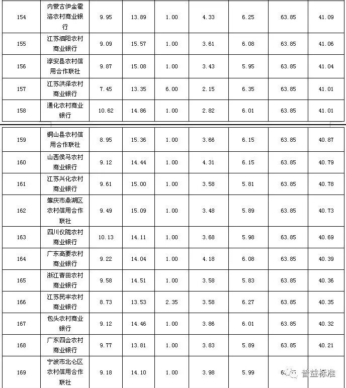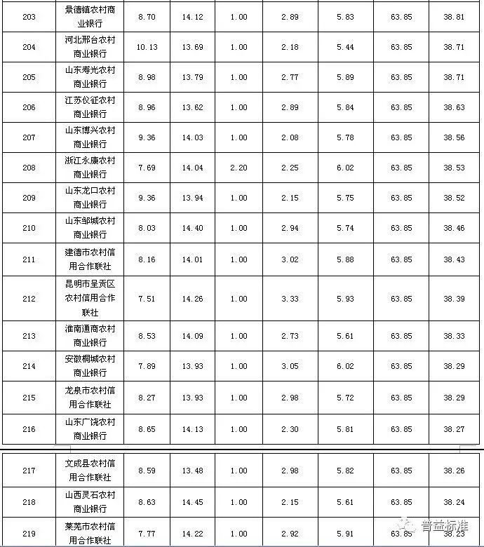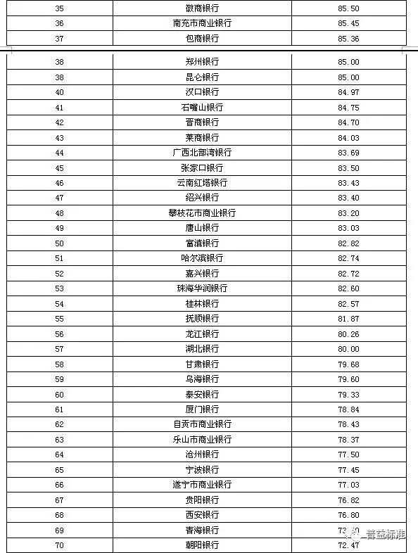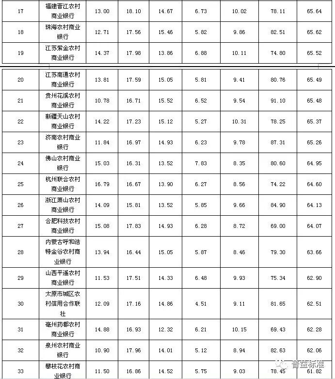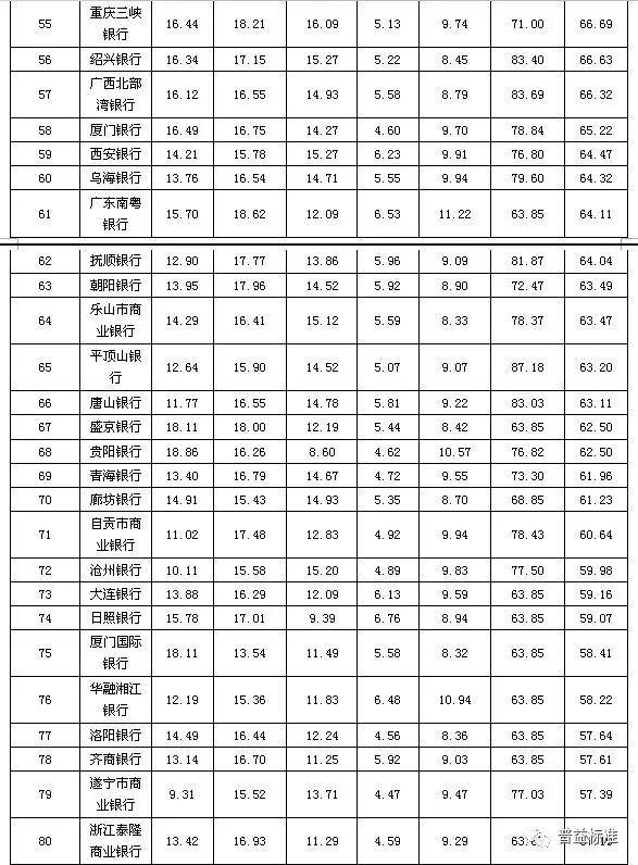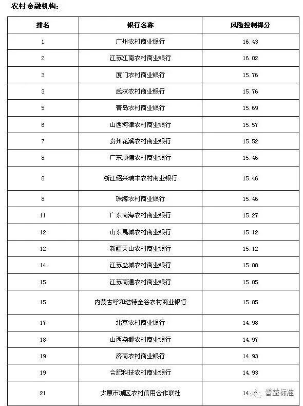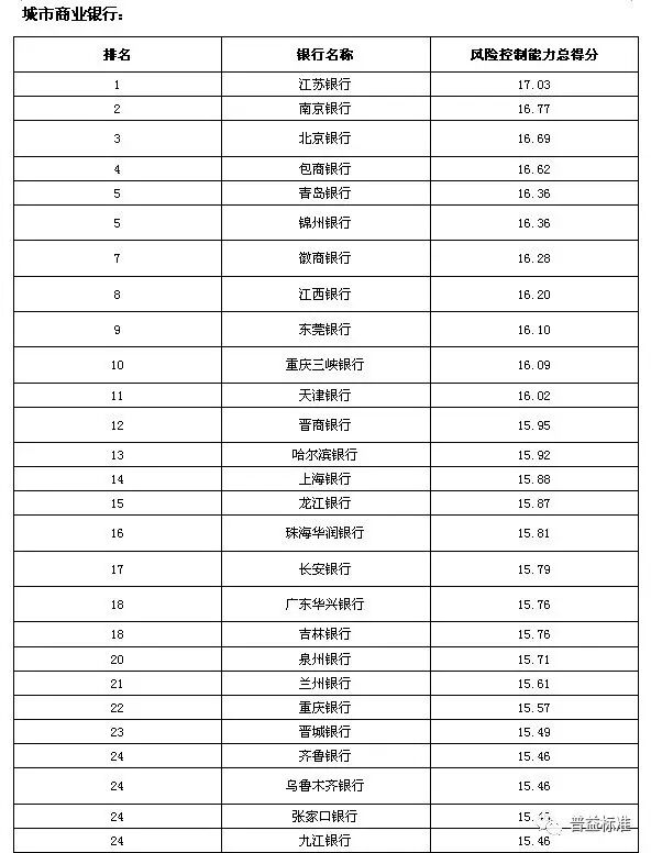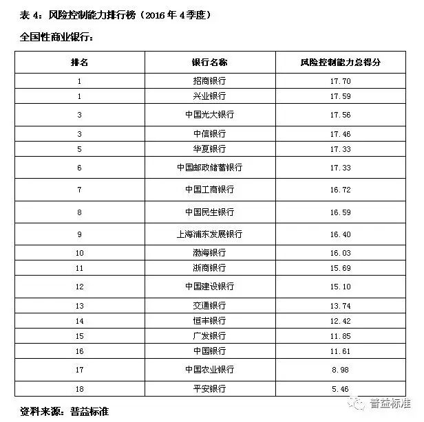 风险控制能力:招商银行、兴业银行、中国光大银行、中信银行、华夏银行和中国邮政储蓄银行居全国性银行前五;江苏银行、南京银行、北京银行、包商银行、青岛银行、锦州银行、徽商银行、江西银行、东莞银行和重庆三峡银行居城市商业银行前十;广州农村商业银行、江苏江南农村商业银行、厦门农村商业银行、武汉农村商业银行、青岛农商银行、山西河津农村商业银行、贵州花溪农村商业银行、广东顺德农村商业银行、浙江绍兴瑞丰农村商业银行和珠海农村商业银行居农村金融机构前十。