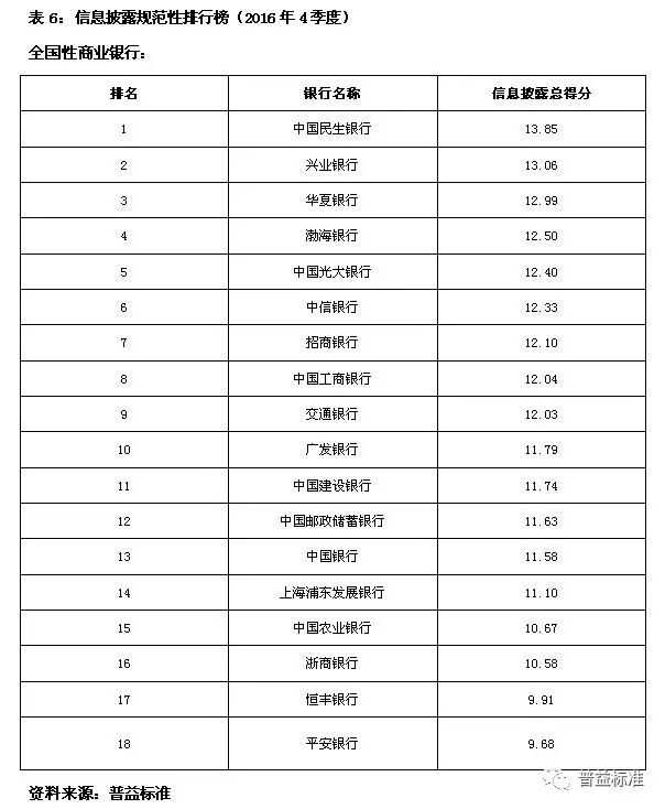 2016年4季度,全国性商业银行中,信息披露规范性排名前五的银行依次是中国民生银行、兴业银行、华夏银行、渤海银行和中国光大银行。