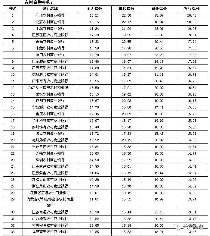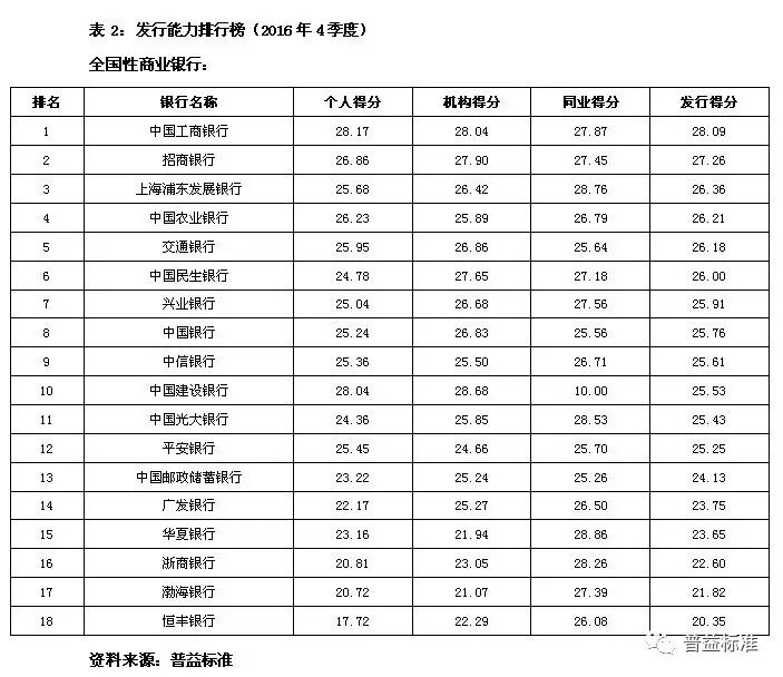 发行能力排名前五的全国性银行依次为中国工商银行、招商银行、上海浦东发展银行、中国农业银行和交通银行;发行能力排名前十的城市商业银行依次为北京银行、江苏银行、杭州银行、南京银行、上海银行、宁波银行、徽商银行、哈尔滨银行、包商银行、天津银行;发行能力排名前十的农村金融机构依次为广州农村商业银行、北京农村商业银行、上海农村商业银行、江苏江南农村商业银行、青岛农村商业银行、东莞农村商业银行、厦门农村商业银行、广东顺德农村商业银行、江苏常熟农村商业银行、杭州联合农村商业银行。
