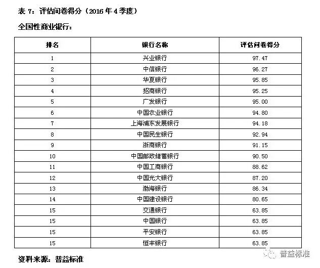2016年4季度银行理财能力排名的评估问卷分数,得分如下: