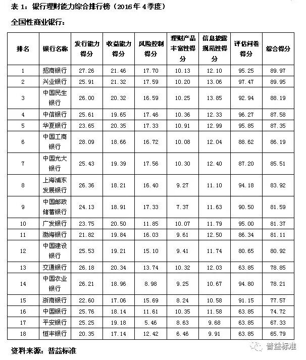 2016年4季度,银行理财能力综合排名和单项排名结果如下:
