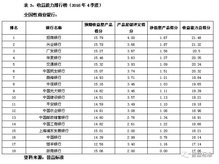 收益能力排名前五的全国性银行依次为招商银行、兴业银行、广发银行、华夏银行和交通银行;收益能力排名前十的城市商业银行依次为南京银行、江苏银行、宁波银行、东莞银行、重庆银行、珠海华润银行、包商银行、广东华兴银行、杭州银行、长沙银行;收益能力排名前十的农村金融机构依次为广州农村商业银行、厦门农村商业银行、福建晋江农村商业银行、江苏紫金农村商业银行、泉州农村商业银行、广东顺德农村商业银行、福建南安农村商业银行、江苏昆山农村商业银行、合肥科技农村商业银行、青岛农村商业银行。