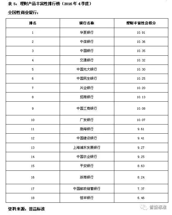 2016年4季度中,全国性商业银行中,理财产品丰富性排名前五的银行依次是华夏银行、中信银行、中国银行、交通银行以及中国光大银行。