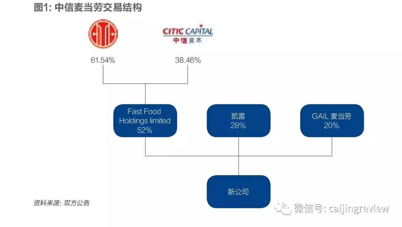 本次交易结构为:中信股份、中信资本、凯雷投资以及麦当劳联合组建新公司,以最高不超过20.8亿美元(约合161.4亿港元)的总对价收购麦当劳在中国内地和香港的业务,收购对价将部分以现金方式及部分向麦当劳发行新公司之股份的方式结算。交易完成后,中信股份和中信资本在新公司共将持有52%的控股权,凯雷和麦当劳分别持有28%和20%的股权。交易完成后,新公司通过获得的大陆与香港20年的“主特许经营权”,可在中国内地和香港经营麦当劳餐厅。