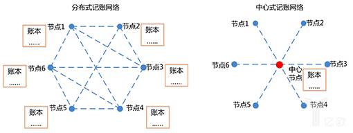 (CCIDConsulting:分布式账本与中心式账本对比示意图)