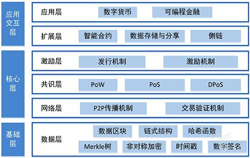 在应用层面,围绕数字经济、互联网治理和大数据发展中的价值实现,区块链规划的应用场景分为政用、民用、商用3类,包括应用层、合约层、激励层、共识层、数据层、网络层6个层次。