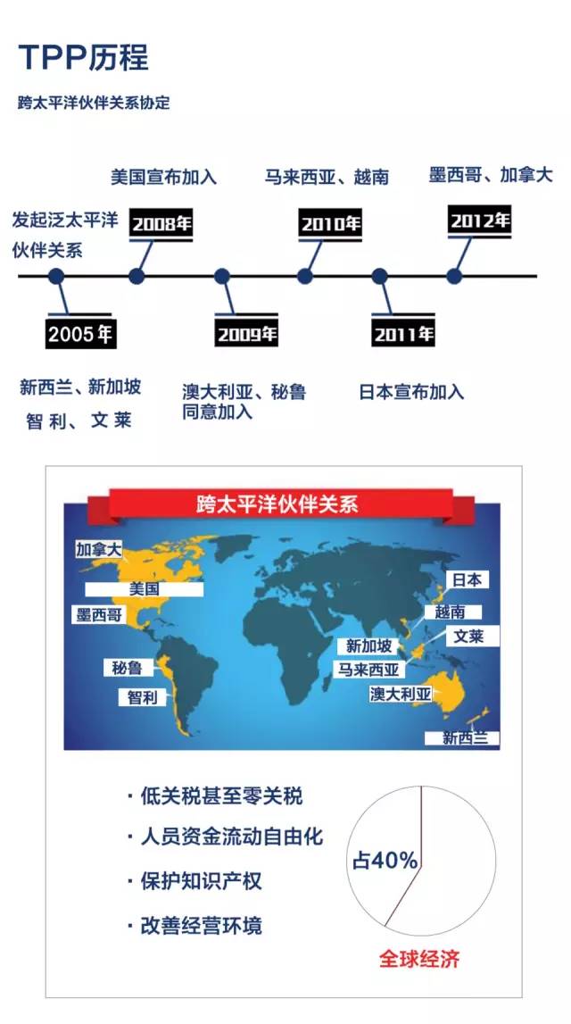 TPP最初是由新西兰、新加坡、智利和文莱四国发起的一项多边自由贸易协定,美国后来加入其中,并主导谈判,日本、加拿大、澳大利亚、墨西哥、越南、秘鲁、马来西亚等共12个成员参与。