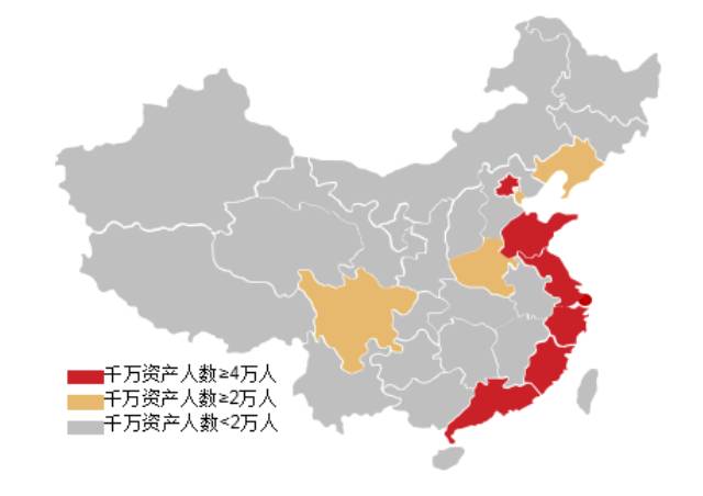 根据胡润研究院发布数据显示,中国千万资产人数超过130万,高净值人群在地域分布上集中在东部和南部地区, 2016年华东六省一市(山东、上海、浙江、江苏、安徽、福建、江西)千万资产人数合计为58.11万人,约占比43%;华北地区(北京、天津、河北、山西、内蒙古)千万资产人数略少于华东,为30.85万人,占比约为23%;华南地区(广东、广西、海南)千万资产人数为25.25万人,占比接近20%;中西部省份千万资产总人数占比最低,合计约15%。
