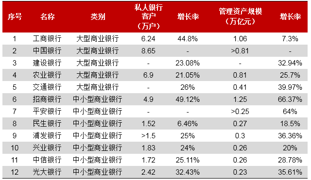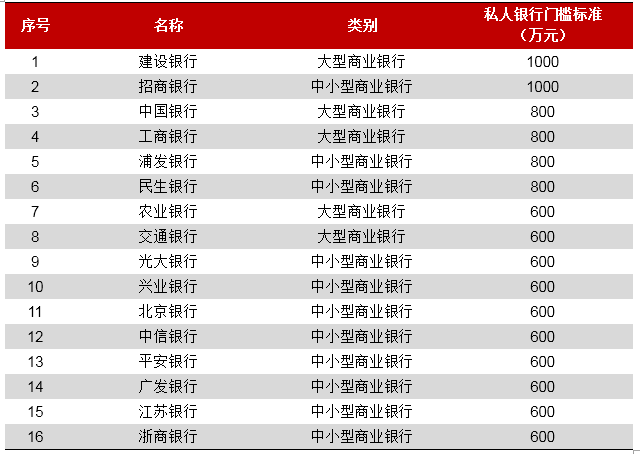私人银行是针对高端个人客户量身定做的财富管理服务,是商业银行业务中最顶尖的部分,目前在国内尚处于起步阶段。2005年瑞士友邦银行在中国开业,这是中国出现的第一家私人银行。2007年,中国银行股份有限公司在北京和上海创立了私人银行业务服务部,这是国内真正意义上的本土私人银行服务。随后招商银行、工商银行等分别展开了各自的私人银行业务。2011年8月28日,中国银行业监督管理委员会发布《商业银行理财产品销售管理办法》,规定“私人银行客户是指金融净资产达到600万元及以上的商业银行客户”。各大银行在此基础上设定了更高的门槛标准,目前国内私人银行门槛有1000万元、800万元和600万元三档,其中建设银行和招商银行的私人银行门槛最高,为1000万元(各家银行私人银行门槛标准详见下表)。