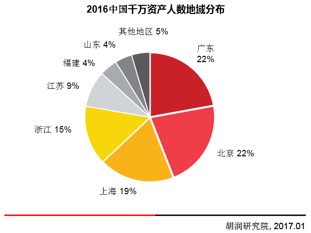 2016年,全国千万资产人数排名第一的为广东省,千万资产人群达24万人;千万资产人数排名第二的为北京市,共23.8万人;千万资产人数排名第三是为上海市,达到20.5万人;千万资产人数排名第四的为浙江省,共16万人,4个地区千万资产人群合计为84.3万人,占全国千万资产总人数的63%。