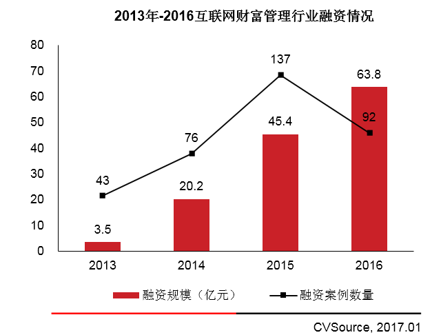 根据投中数据终端CVSource显示,2016年互联网财富管理公司获得融资案例为92起,融资总规模为63.8亿元,相较于2015年,融资案例数量下降32.8%,但融资总规模增长40.5%,自2013年起,互联网财富管理公司融资总规模持续上升,融资案例数量在2015年出现拐点,出现这一现象与2016年互联网监管风暴有关。