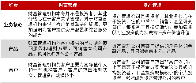 从概念上看,在《2015年中国财富管理行业研究报告》中将财富管理的含义概括为“以客户为中心设计出一套全面的财务规划,通过向客户提供现金、信用、保险、投资组合等一系列的金融服务,将客户的资产、负债、流动性进行管理,以满足客户不同阶段的财务需求,帮助客户达到降低风险、实现财富增值的目的”的金融服务;而资产管理是由资产管理人根据资产管理合同约定的方式、条件、要求及限制,对客户资产进行经营运作,为客户提供证券、基金及其他金融产品。