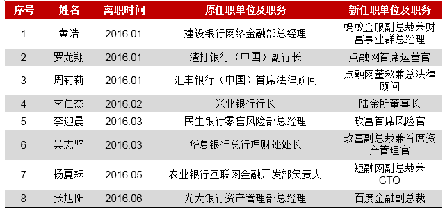 2016年银行高管出现离职潮(详情见下表),互联网财富管理平台成为热门选择之一。一方面,受互联网金融的冲击,银行业“揽储”压力加大,“结算”业务受阻,经济效益下降;2015年开始执行央企“限薪令”,银行高管收入水平下降,而互联网财富管理平台许以高职位、高薪水,吸引了不少银行高管加入,例如原兴业银行行长李仁杰加盟陆金所任董事长一职;原建行网金部总经理黄浩加盟蚂蚁金服任职副总裁,分管蚂蚁金融财富条线;原农行互联网金融开发部负责人杨夏耘担任短融网副总裁兼CTO;光大银行资产管理部总经理张旭阳离职加盟百度金融;原渣打中国总行副行长罗龙翔、原汇丰银行中国区首席法律顾问周莉莉,也在今年初齐齐入职点融网。