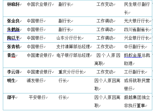 具体来看,本年高管离职潮,主要集中于银行系统内流动,离职、退休,加入民营银行、互联网等金融领域。