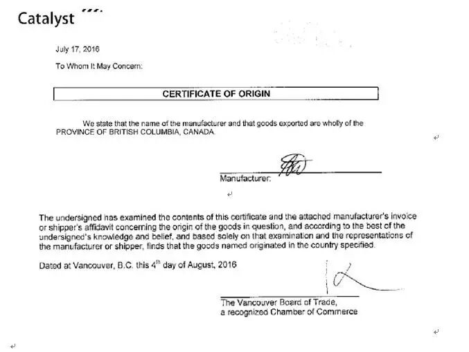如果案例一中的所有单据,除产地证外,出具日期均为2016年7月17日。然而,产地证除左上方显示日期“JULY 17,2016”之外,下方另显示”DATED AT VANCOUVER,B.C. THIS 4TH DAY OF AUGUST,2016”,且同时有制造商和当地商会的签字,如下图所示: