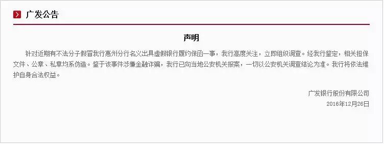 12月26日,广发银行发布声明称:“经我行鉴定,相关担保文件、公章、私章均系伪造,并称“我行已向当地公安机关报案,一切以公安机关调查结论为准”。