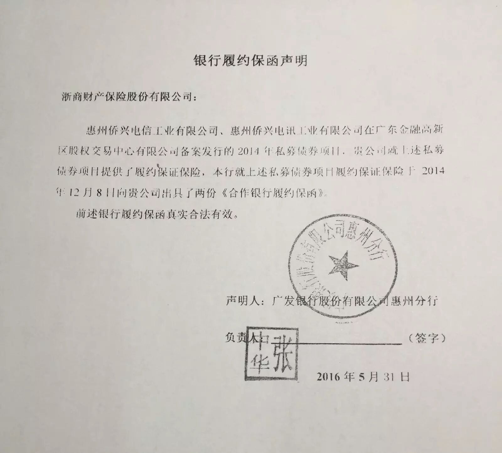 12月25日,浙商财还公布了一份《银行履约保函声明》。该险企介绍道,“2014年12月8日,我司工作人员在侨兴公司人员陪同下,在广发银行惠州分行营业场所办理了银行保函面签手续;2016年2月1日,我司工作人员前往广发银行惠州分行进行保后回访,广发银行惠州分行出具了回访回执。5月31日,我司工作人员和顾问律师前往广发银行惠州分行核查保函情况,广发银行惠州分行向我司出具了《银行履约保函声明》”。