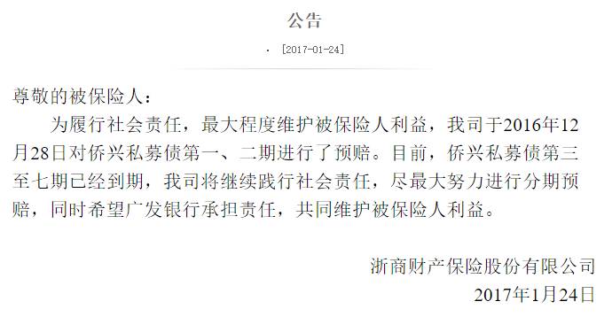 2017年1月24日,浙商财险在其官网发布公告称,将对侨兴私募债第三至七期进行分期预赔。同时,浙商财险还在公告中称,“希望广发银行承担责任,共同维护被保险人利益。”