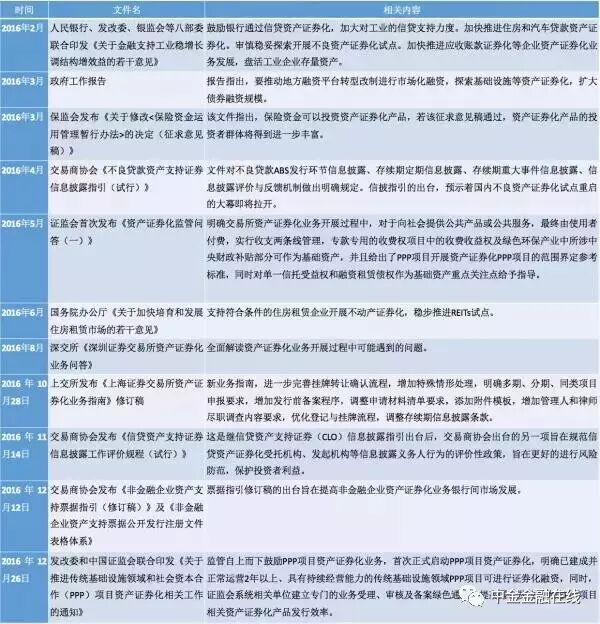 2016年,为盘活存量资产、降低企业杠杆,国务院、人民银行、发改委、银监会、保监会、交易商协会文件、上交所、深交所先后多次发文推动资产证券化的创新与落地。在各类政策利好和市场需求刺激下,资产证券化业务开展如火如荼。