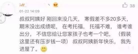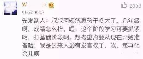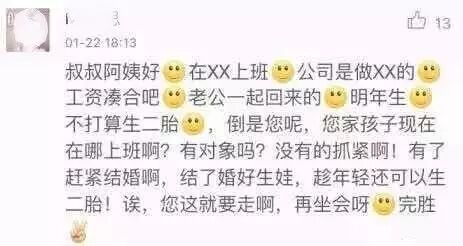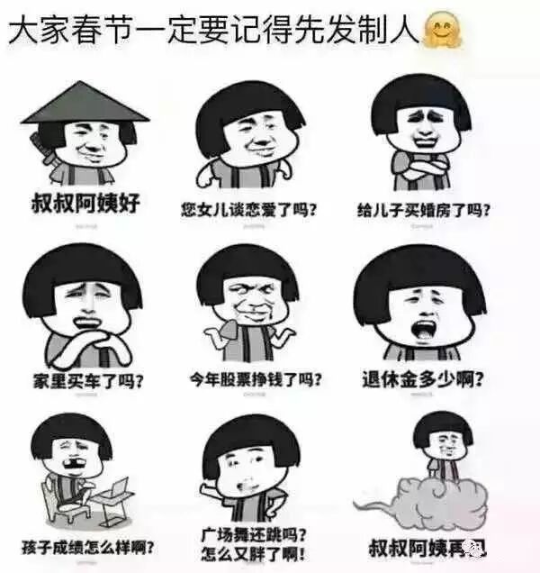 你:哈哈,别聊我了,您家孩子做什么的呀?月薪多少?买车买房了吗?结婚了吗?什么时候要小孩儿?要生二胎了吗?(顺便附送精华攻略一张,收好不谢~)