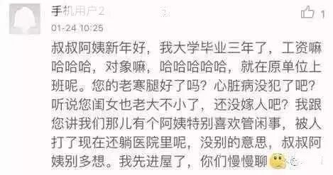 叔叔阿姨好/今年XX岁了/在XXXX上班 是做XXXX的/对,就是那个工作/感觉还行吧/二月中回公司/寒假就几天/工资够用/对象?我随缘/叔叔阿姨新年快乐/我先进屋了。