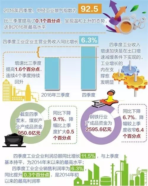 2016年四季度,中经工业景气指数为92.5,比三季度提高了0.1个百分点,呈现温和上升的态势,达到2016年最高水平。经初步季节调整,四季度工业企业主营业务收入同比增长6.3%,增速比三季度提高1.6个百分点,连续4个季度持续回升。最新数据显示,2016年最后三个月中国制造业采购经理指数分别为51.2、51.7和51.4,均处于扩张区间,整体为年内最高水平。