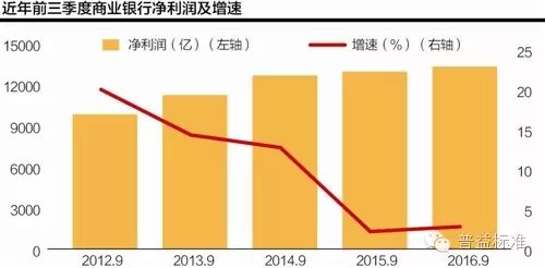 根据银监会披露的数据,截至2016年三季度末,商业银行当年累计实现净利润1.32万亿,同比增长2.82%。利润增速相比去年同期略有上升,但相比2012-2014年同期下降十余个百分点。