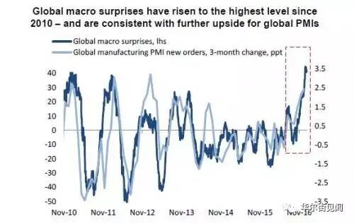 德银欧洲股票策略师Sebastian Raedler在看到1月的PMI初值之后表示,虽然全球增长势头触及六年最高水平,全球宏观意外指数更是升至45,创近七年最高,逼近峰值。