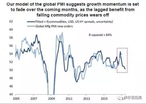 我们的全球PMI模型显示,全球增长已经出现反弹,这是由于金融环境因高收益率利差趋紧以及美元走强对经济拖累的程度变低而放松。然而,由于商品价格下跌带来的滞后收益效应正在消退,这也意味着经济反弹势头应该会开始褪色。