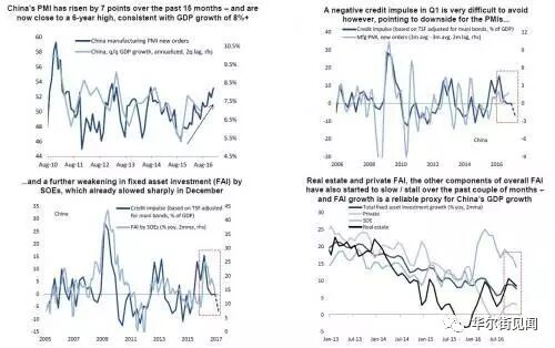 中国PMI也已经接近六年最高水平,过去15个月攀升了7个点。它们指向了8%的年化季率GDP增速,信贷刺激增速可能转为负增长。这表明,中国经济增长势头可能转变。