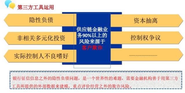 4、管理信用的风险,特别是要利用第三方的反欺诈的工具,我认为供应链金融业务,90%以上的风险来自于客户的欺诈,包括控制权的争议、资本的抽离、隐性负债等等。