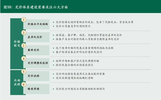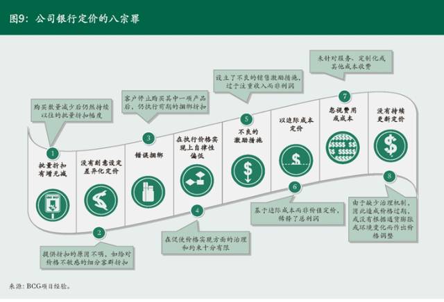 除客户覆盖模式之外,如何针对一线客户经理进行更加有效的销售管理和考核也是许多银行面临的难题。国内银行的客户经理过去普遍依靠个人关系进行销售,同时由于专业的局限性,往往仅专注于简单的信贷产品。未来随着公司银行业总体对信贷业务依赖度的降低,以及从单一产品向交易银行、投资银行等综合解决方案的转型,对一线客户经理的销售技巧、效率、专业性等提出了更高的要求。根据BCG对全球销售效率最高的银行的分析,卓越的销售业绩背后往往需要一套完整的机制,包括:根据BCG全球公司银行绩效对标数据库的分析,充分运用以上工具的领先银行,其单个客户经理的价值创造能够达到行业平均水平的2.4-3.2倍。可以说,差异化的客户覆盖和高效的销售管理是公司银行管理专业化、精细化的集中体现。随着Basel III在中国的全面实施和落地,对公业务要改变过去被动、事后的风险管理方式,从业务模式、产品创新、管理工具和绩效考核上全面对接最新风险和资本管理要求,转向更加重视资产质量、低资本占用的发展方向。首先,公司银行需要控制风险的集中爆发。要配合国家供给侧改革大方向,严控高风险行业信贷增量,如产能过剩行业、三四线房地产、城投平台及监管重点关注行业的信贷规模,并监督客户、行业和地区集中度风险指标。及时调整资产结构,优化资产组合配置。进入2016年,市场已经有部分银行牺牲规模的高增长而加大对存量资产的集中处理,风险暴露呈现趋缓态势,不良高发的态势得到有效遏制。而与此同时,仍有部分同业在高歌猛进扩大规模,无疑给后续的风控工作带来更大挑战。二是要盘活存量,创造有弹性的信贷管理能力。通过加强与金融同业的合作,特别是保险公司、社保基金管理人等,实现发行——分销的直通式服务,在盘活存量资产、减轻风险压力的同时,创造额外的收入。对于银行而言,为了实现信贷资产的“再创造”与“流转”,银行需要具备较强的投行和金融市场能力、结构化产品创设能力、承销能力以及信贷组合综合管理能力,并打通信贷与金融市场部门间的壁垒,从分润机制、精细化的管理会计和内部资金转移定价等方面支持“信贷资产转移”的顺利进行。需要特别强调的是,对于中国的银行业而言,尽管资产证券化类业务在过去的两年实现了快速发展,但鉴于其整体交易结构复杂、利益相关方繁复、可能涉及跨监管管理,在实际进行证券化工作时,银行特别需要在产品创立、交易结构设计、发行和交易等不同阶段明确各参与主体的责任认定,确保做到真正意义上的风险隔离和信贷资产出表。三是要加强轻资本产品的创设,拉动低资本轻资产业务的增长,特别是交易银行、投行业务等业务。随着客户更加多元化,如上市公司、科技企业和地方政府的金融需求日趋复杂,银行在提供综合金融解决方案时,要充分发挥自身在资金来源和交易设计中的重要地位和优势,强化投行和资产管理能力,在债券承销外,与证券、直投、国有资管公司、私募基金等多牌照子公司合作,针对不同行业采用投贷联动、基金类(如并购基金、夹层基金)融资以及PPP、产业基金等方式提供更加多元的融资产品和服务。与此同时,风险管理条线需要与产品及前线业务人员紧密合作,提高业务人员的风险敏感性,加强由于业务创新带来的新风险管控,避免出现在资金募集过程中误导销售或资产发起中债权不清、集中度过高而导致的风险传染、刚性兑付、声誉受损等重大风险。第四个抓手是基于价值的定价。根据BCG的全球观察,商业银行在定价的过程中通常会犯这样几个错误,我们称之为“八宗罪”(参阅图9)。中国银行业最常出现的问题是“1) 批量折扣有增无减”和“8) 没有持续更新定价”。第一,批量折扣有增无减。当企业客户和银行就一笔信贷业务谈判时,客户往往会给出一些额外的承诺,例如未来使用银行的外汇业务或者兼并顾问业务等等。然而分析发现,85%的案例中,企业客户的这些承诺最终都没有兑现。因此银行需要设计定期审核制度,去了解客户的盈利能力和风险,确保客户实现购买时的承诺。如果发现客户购买数量逐步减少,且没有可见的反弹的空间,则应该重新定价,不能让批量折扣只增不减。第二,没有持续更新定价。由于缺少相应的治理机制,银行缺乏对于通货膨胀或人口社会政策变化的动态追踪,往往造成所设定的价格与收入确认的节点脱节。研究发现,大多数的银行对于50%以上的客户,在五到十年间都没有调整过服务的价格。如果在高通货膨胀或是最低工资持续上涨的环境中,这会侵蚀银行真正的资本回报,造成利润损失。为了克服上述定价方面的误区,更好地开展精细化的定价体系建设,我们建议从价格制定和内部流程这两个层面,把握六大方面的主要工作(参阅图10)。 第一,要合理设定价格水平及结构。定价需要反映所有有关的成本要素,如资金、风险、资本和运营成本,并且要充分考虑竞争环境的差异,如与竞争对手的价格差异、是否符合银行自身战略,对银行在市场中地位的影响等。第二,要形成差异化的价格。银行需要探索如何按客户未来对银行的预期综合收益提供差异化定价。在定价指引中,明确定义对于有不同潜在价值的客户能够提供的优惠幅度。 第三,重视最终定价。银行对于低于指导价格的优惠业务建立明