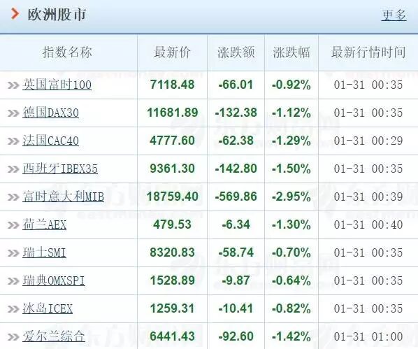 除了美国股市,欧洲三大股指在当地时间1月30日的表现也不理想: