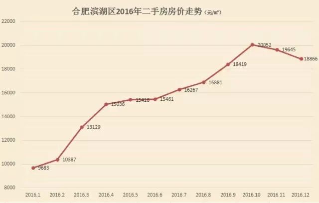 根据合房网二手房中心监测数据显示,2016年1月到限购重启的10月,合肥滨湖新区二手房挂牌价格从9683元/㎡疯涨到20052元/㎡,房价的飙升吸引了大量投资客和二手房中介公司的进驻。