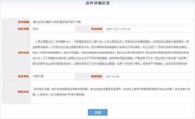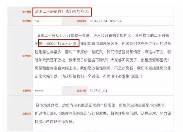 该投诉者表示:近期蜀山区房价暴跌16%,下跌幅度是各区之最。而目前合肥二手房开启抛售模式,房价已经崩盘,政府却拿新房价格说保持稳定,我们业主表示极其愤怒,百姓资产大幅缩水。