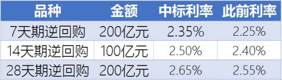 14天期逆回购操作中标利率2.5%,此前为2.4%;